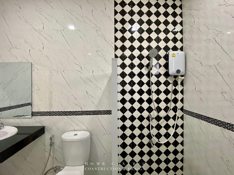 ทางด้านของห้องน้ำนั้น ภายในจัดสรรพื้นที่ใช้สอยได้อย่างเป็นสัดส่วนภายใต้โทนสีขาวและดำ พร้อมรายละเอียดการตกแต่งที่หรูหรา