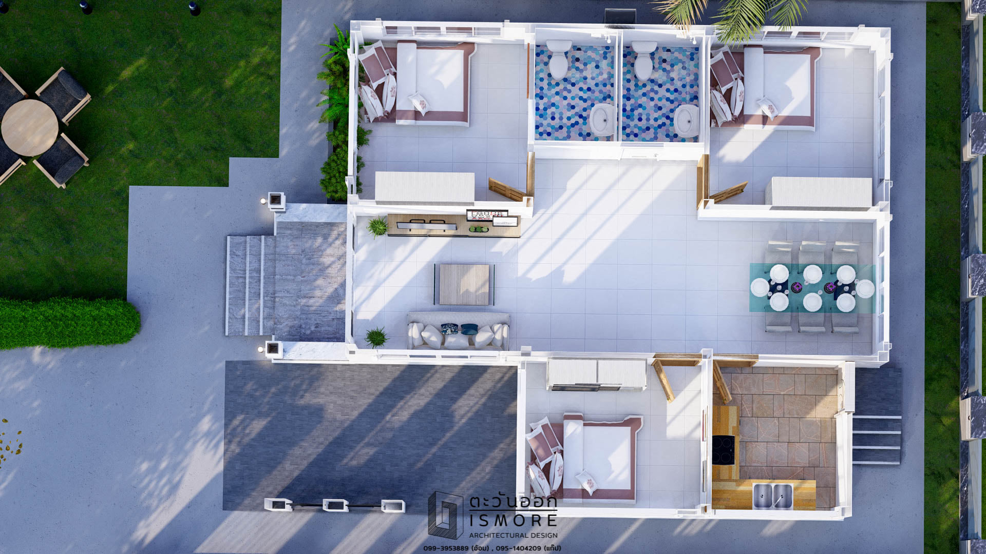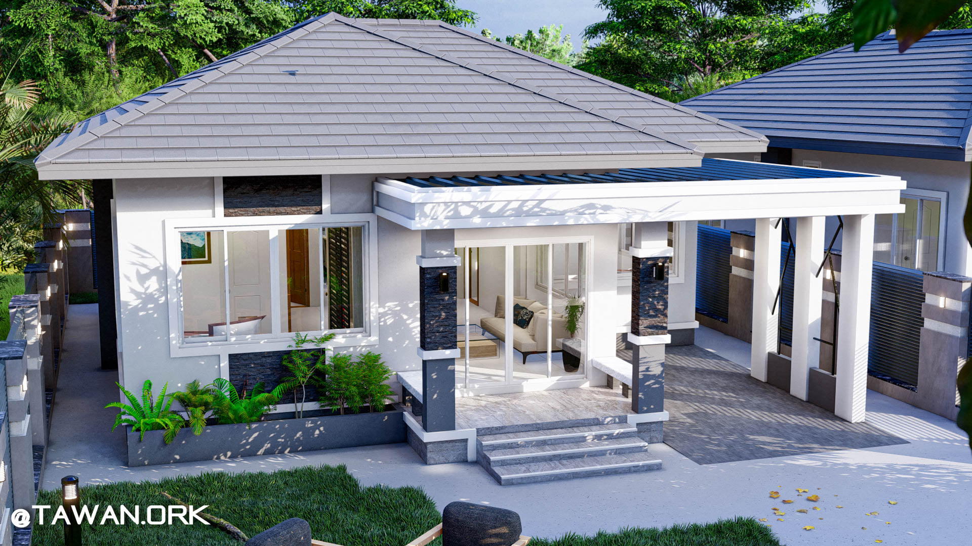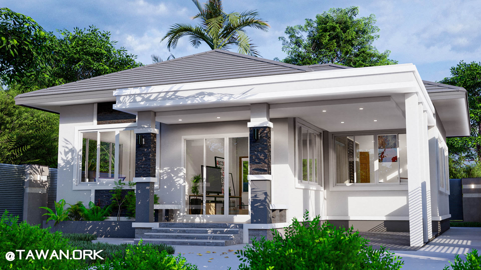 โดยบ้านหลังนี้มีขนาดชั้นเดียว ฐานของบ้านถูกยกขึ้นสูง จึงป้องกันปัญหาน้ำท่วมช่วงฝนชุกได้ดี การออกแบบดีไซน์องค์ประกอบอื่น ๆ ก็สะท้อนความเป็นบ้านร่วมสมัยได้อย่างชัดเจน นอกตัวบ้านตกแต่งด้วยสีขาวครีมยืนพื้น ซึ่งจะช่วยสะท้อนแสงแดด ทำให้บ้านเย็นนั่นเอง