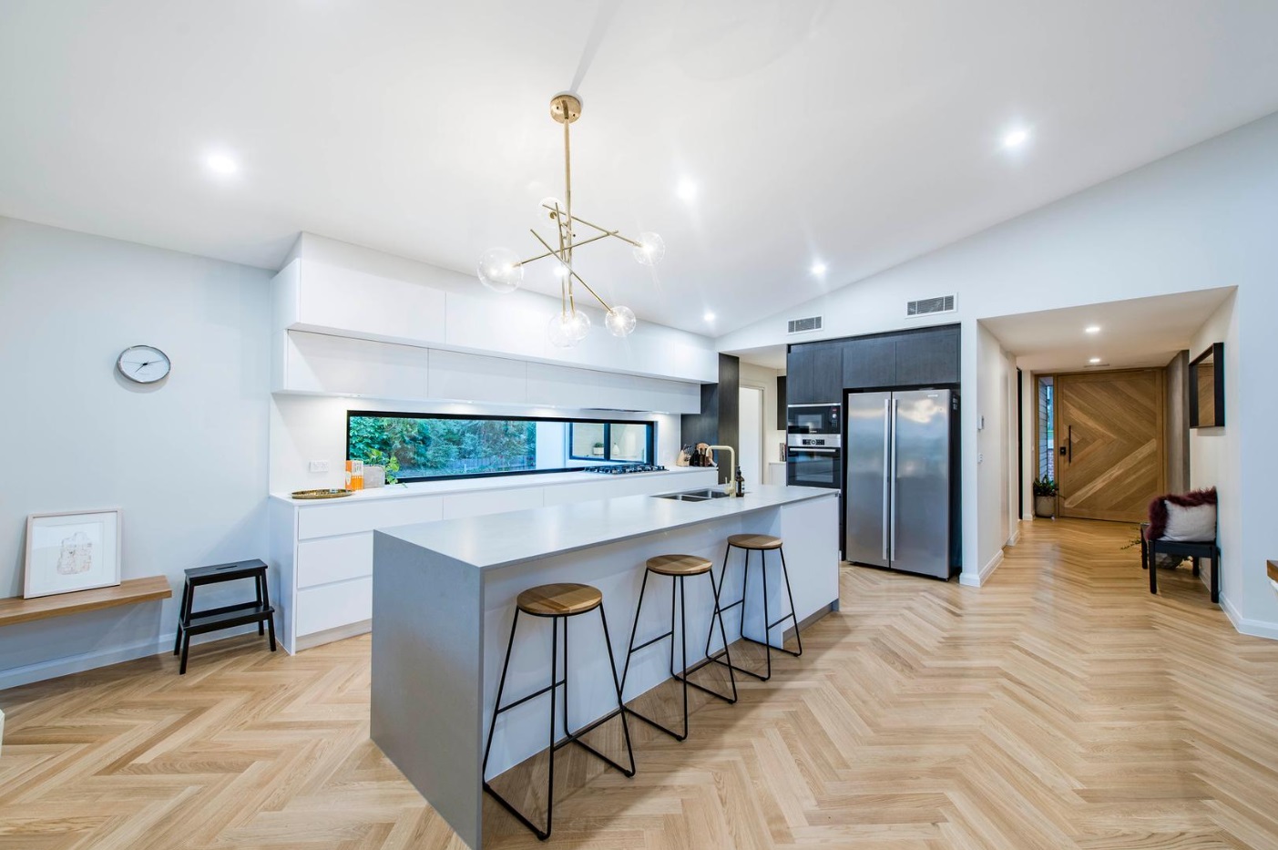 มุมนี้จะเป็นพื้นที่ห้องครัวที่มีพื้นที่ใช้สอยที่กว้างเป็นพิเศษ ภายในประกอบไปด้วยเคาน์เตอร์แบบติดผนัง และเคาน์เตอร์แบบเกาะกลางที่เป็นพื้นที่รับประทานอาหารไปในตัว