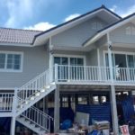 ลักษณะบ้านไม้ชั้นครึ่ง หลังคาทรงหน้าจั่ว ผนังภายนอกใช้ไม้ขัดพื้นผิวธรรมชาติ สวยงามคลาสสิคดูมีเสน่ห์ พร้อมชานบ้านขนาดกว้าง และระเบียงด้านบนเพื่อไว้ชมวิวทิวทัศน์ภายนอก