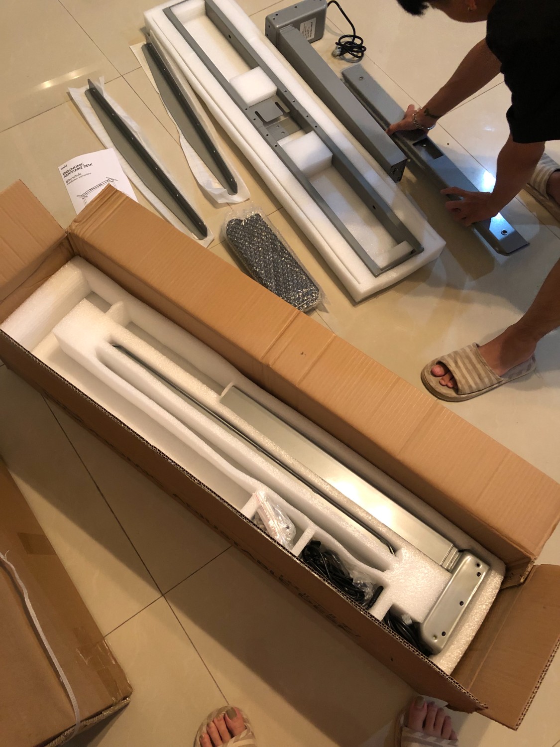 ลองแกะกล่องออกมาแล้วมันก็สมควรหนัก ขาโต๊ะอลังการมากค่ะ ประกอบแล้วดูแข็งแรงสุดค่ะ ตอนประกอบเสร็จเราลองขึ้นไปนั่งดูมันไม่ขยับเลยนะ (เราหนัก 43 กิโล) เรื่องความสูงต่ำก็ไม่ต้องห่วงค่ะ เค้าบอกโต๊ะปรับระดับได้ 60-125 เซนค่ะ