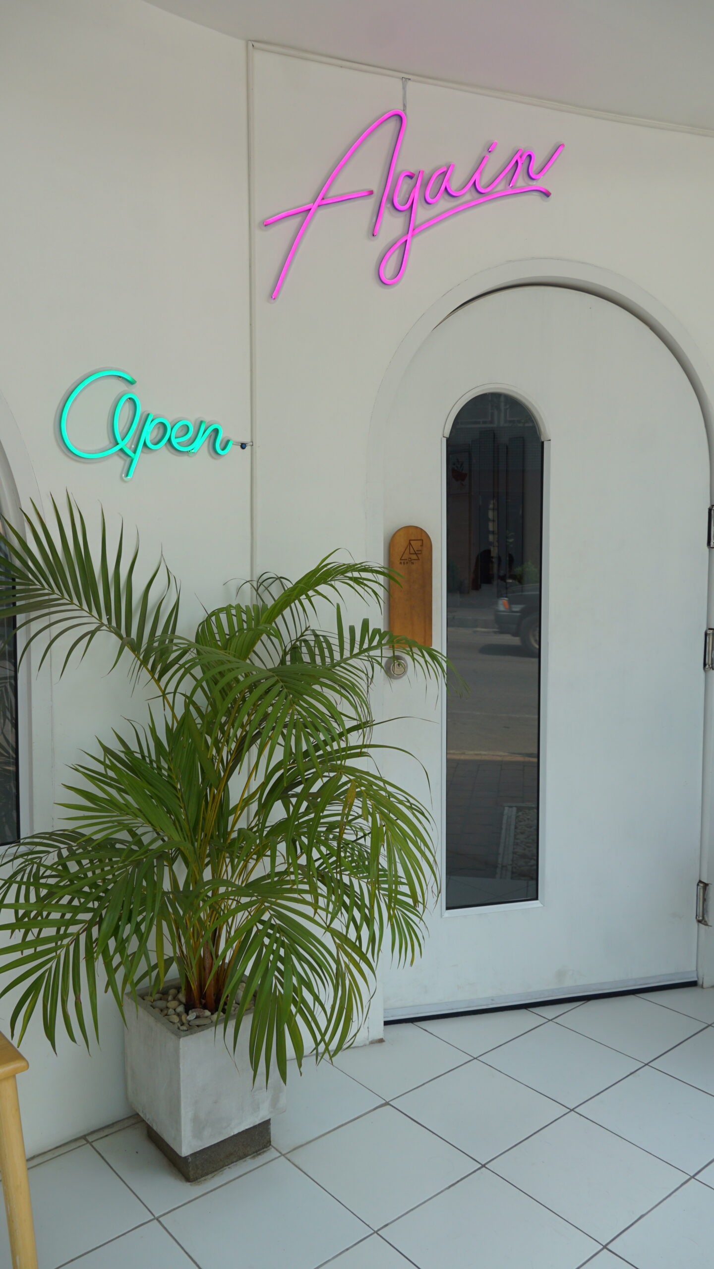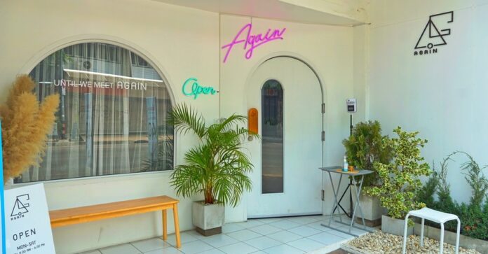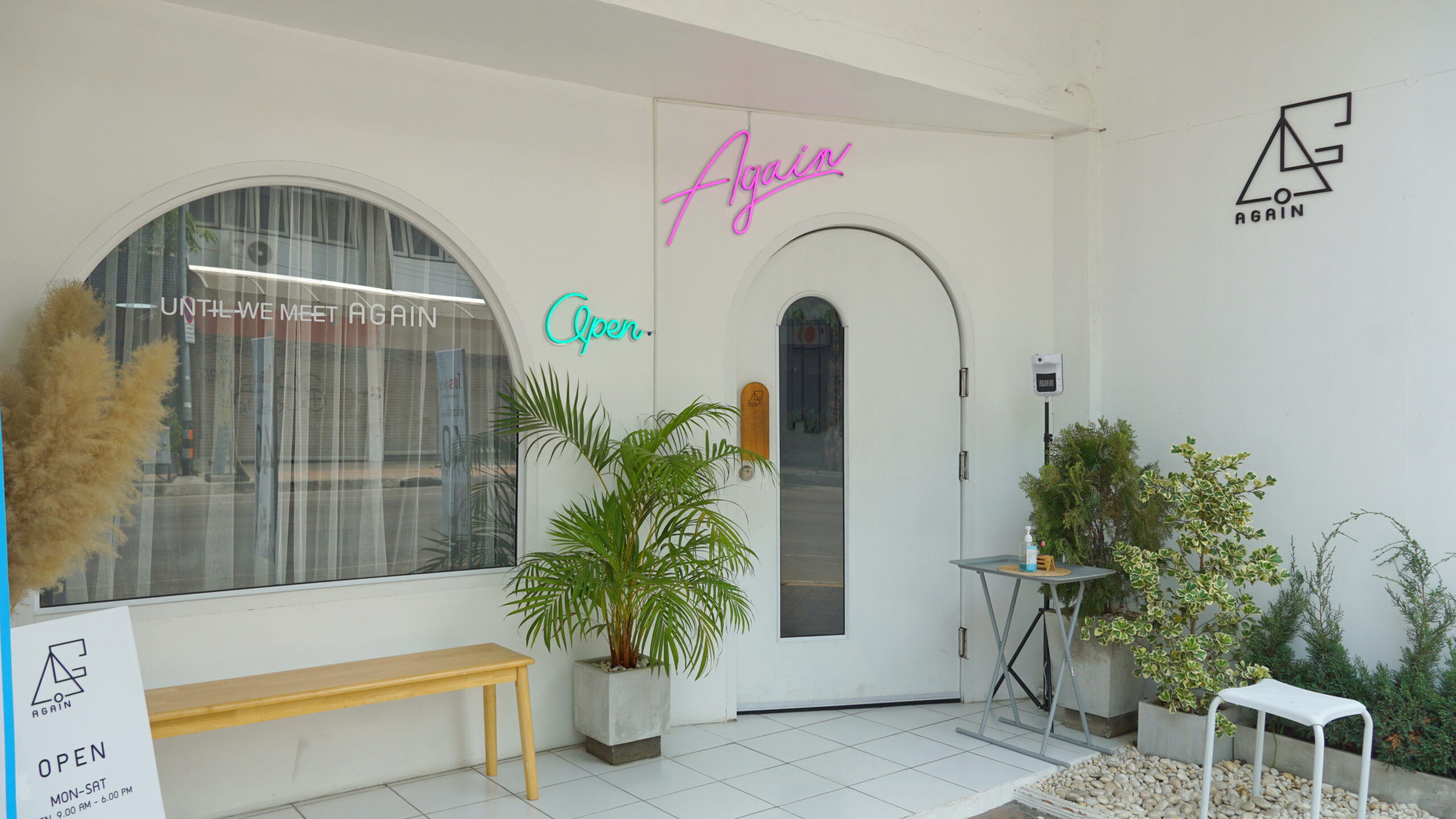ชื่อร้าน Again จากหลอดไฟสีชมชูที่ถูกติดตั้งเหนือประตูทรงโค้ง