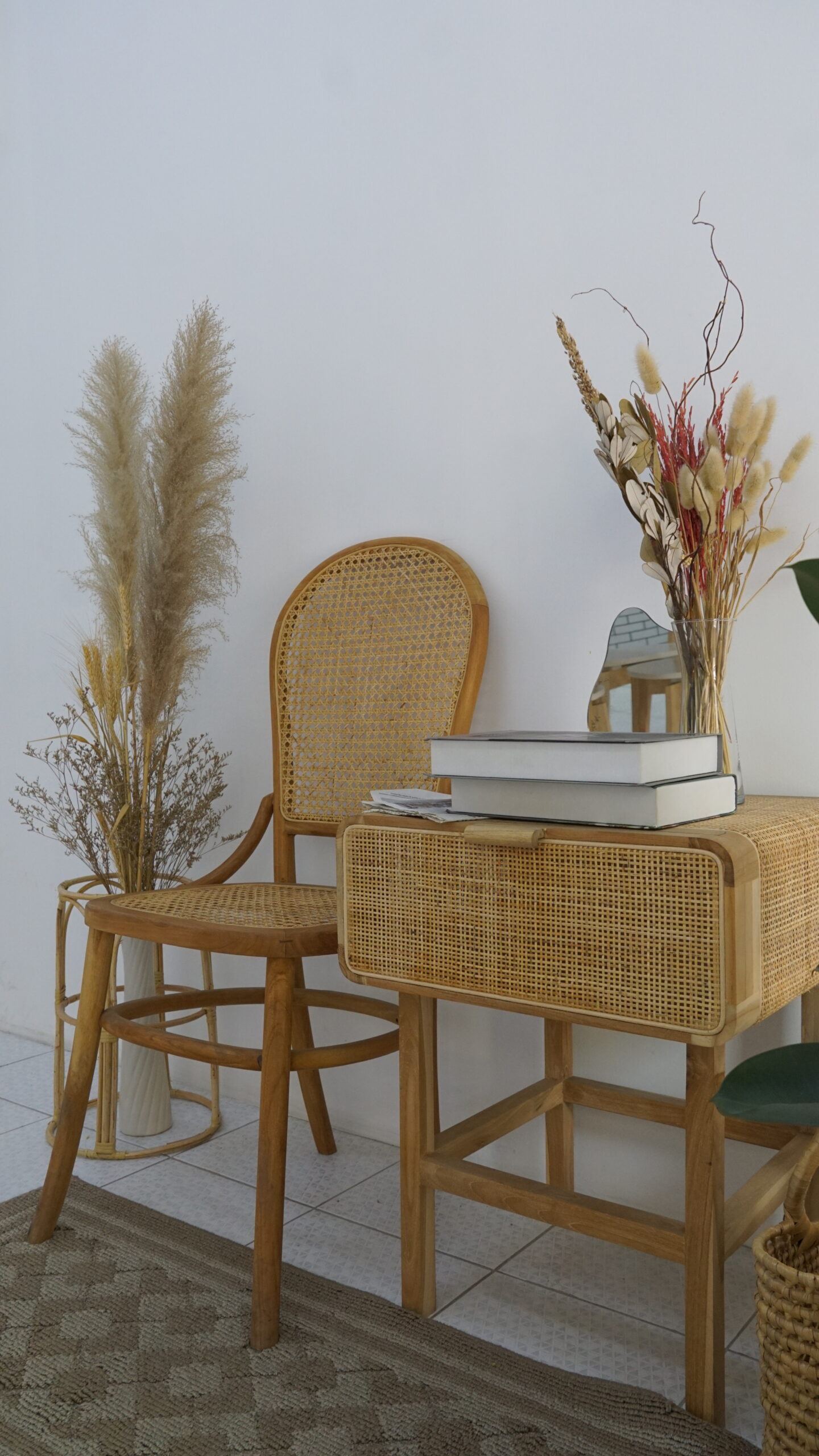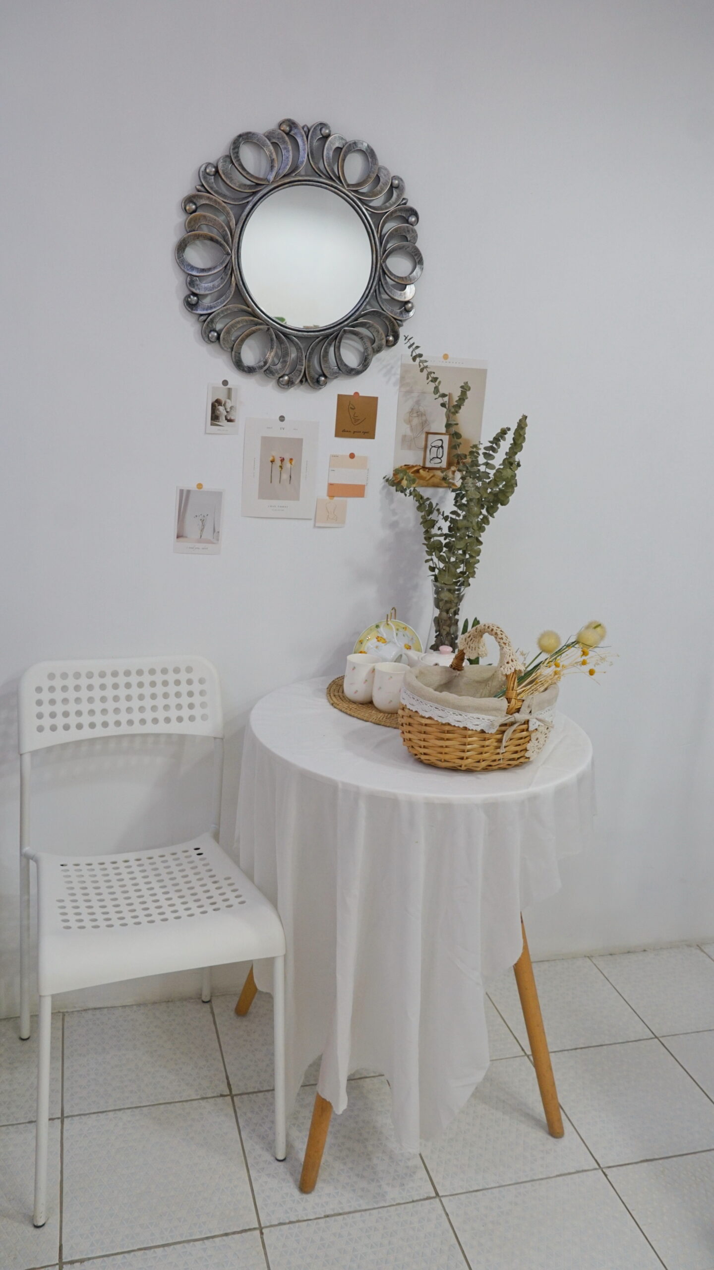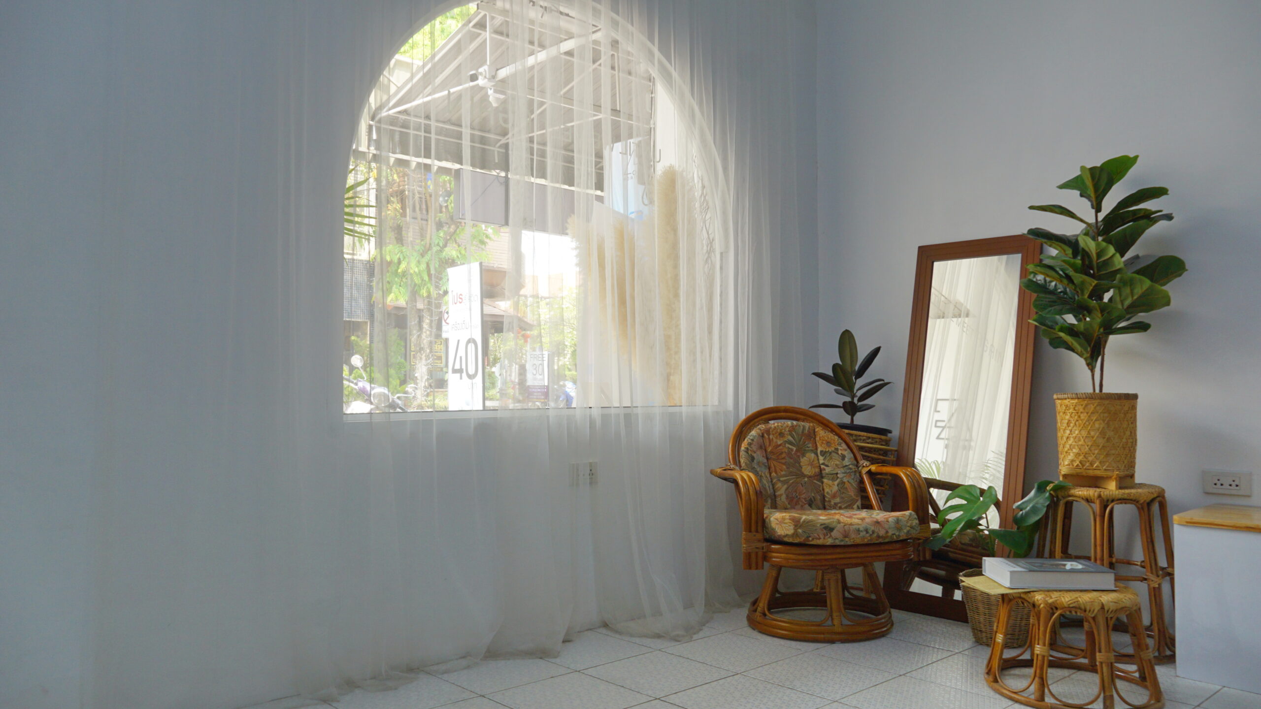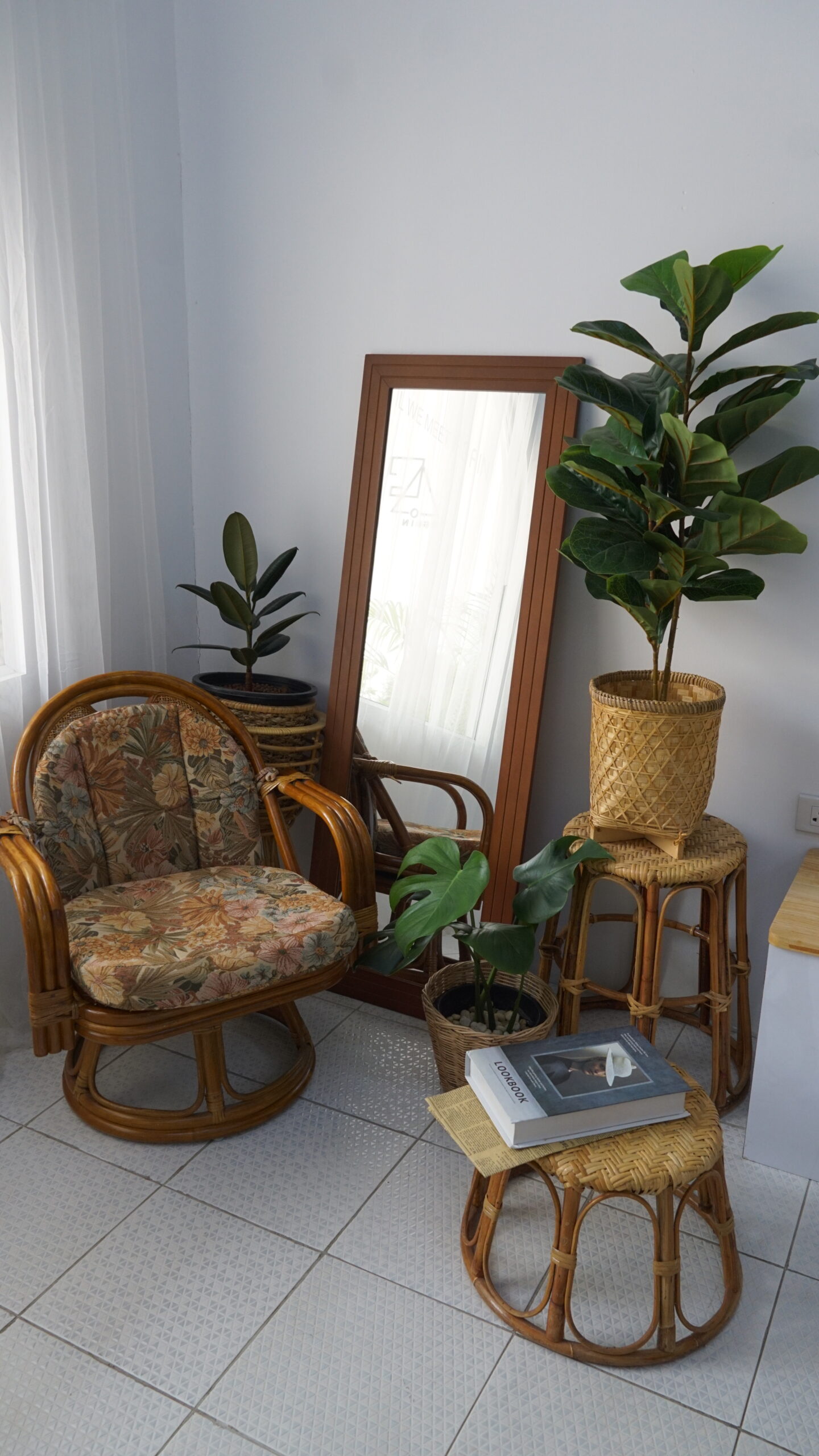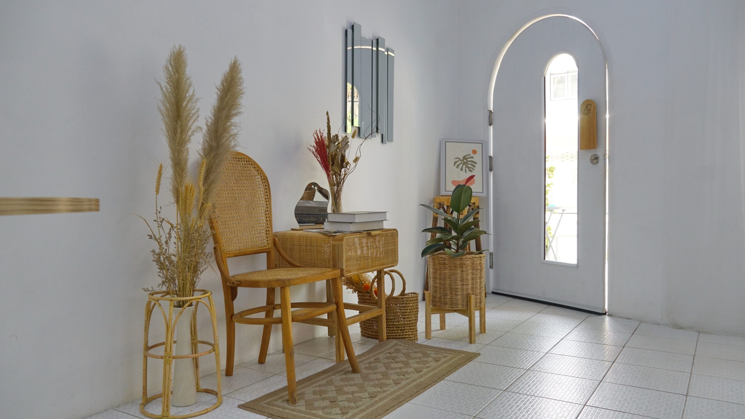 เมื่อเดินผ่านประตูเข้ามา เราก็จะพบกับมุมถ่ายรูปสวย ๆ ที่ตกแต่งด้วยชุดเฟอร์นิเจอร์ไม้หวายในโทนสีน้ำตาลอ่อนที่เข้ากันกับผนังสีขาวของร้าน