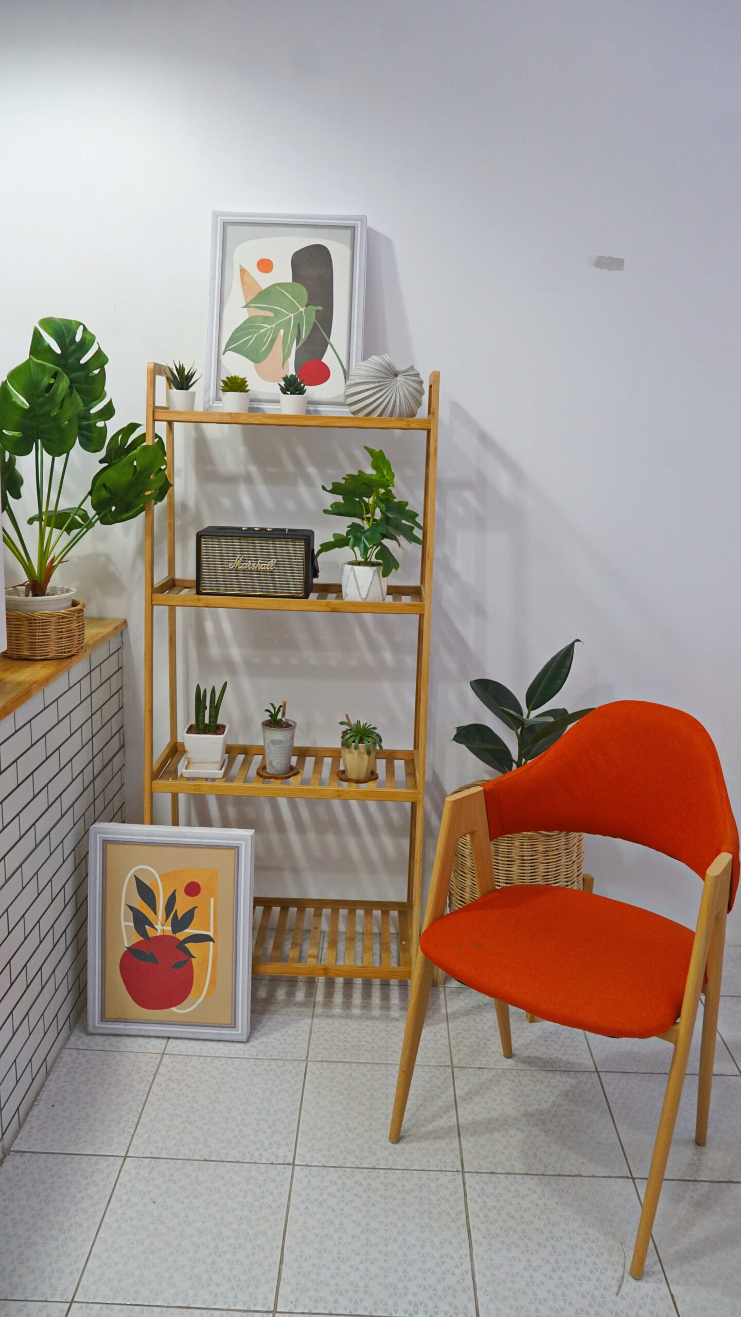 หน้าเคาน์เตอร์เครื่อดื่มถูกตกแต่งด้วยชั้นวางไม้ขนาดพอเหมาะที่ตกแต่งด้วยต้นไม้เล็ก ๆ ที่ชวยเพิ่มความสวยงามและความสดชื่นระหว่างที่เรากำลังสั่งเครื่องดื่มกับขนม