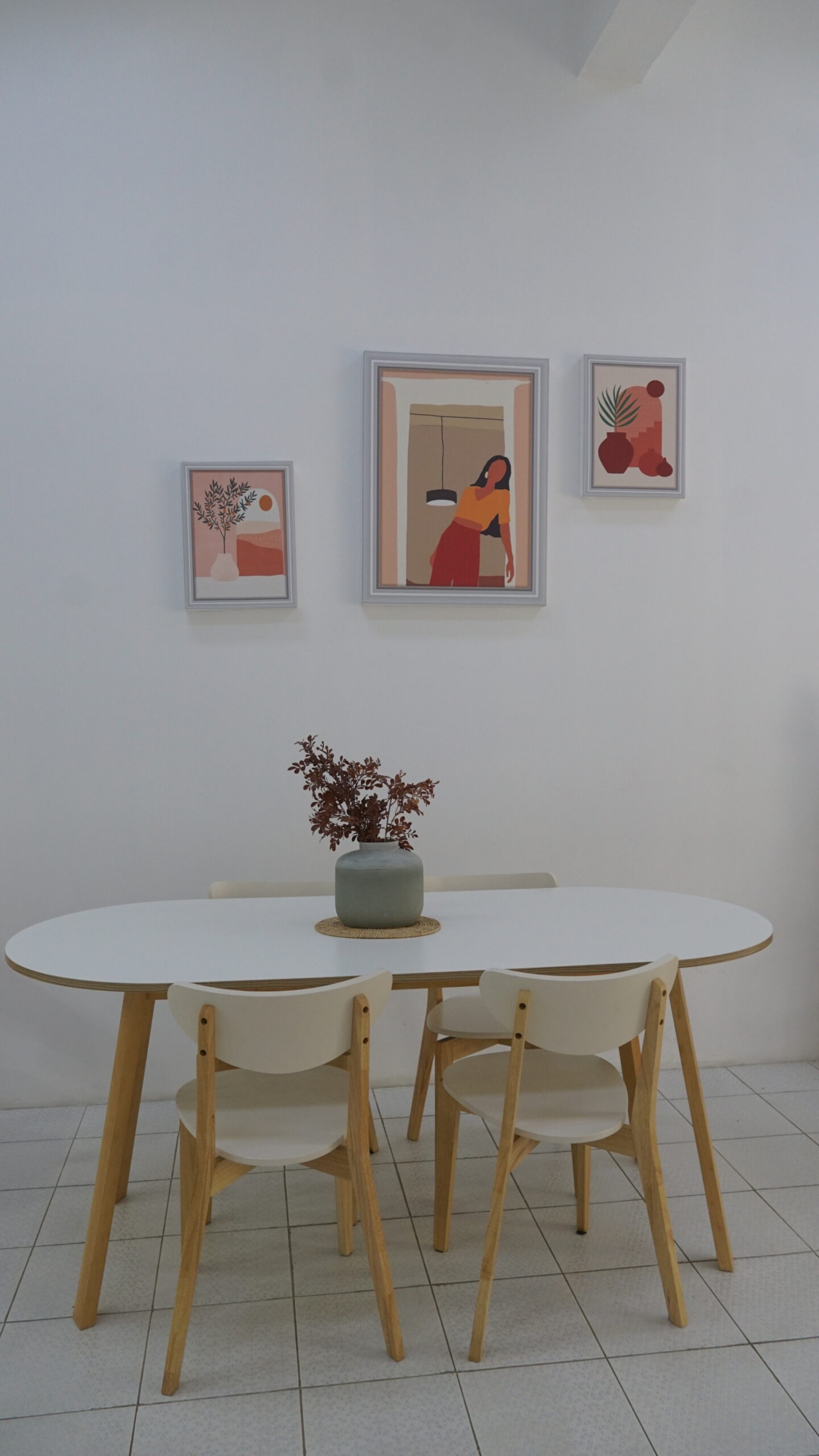 บริเวณตรงกลางร้านถูกจัดวางด้วยโต๊ะยาวตัวนี้ ซึ่งเป็นโต๊ะไม้ที่มีองค์ประกอบของสีขาวและสีน้ำตาลอ่อนที่ผสานกันอย่างลงตัว มีฉากหลังเป็นภาพฝาผนังที่เข้ากับสไตล์มินิมอล