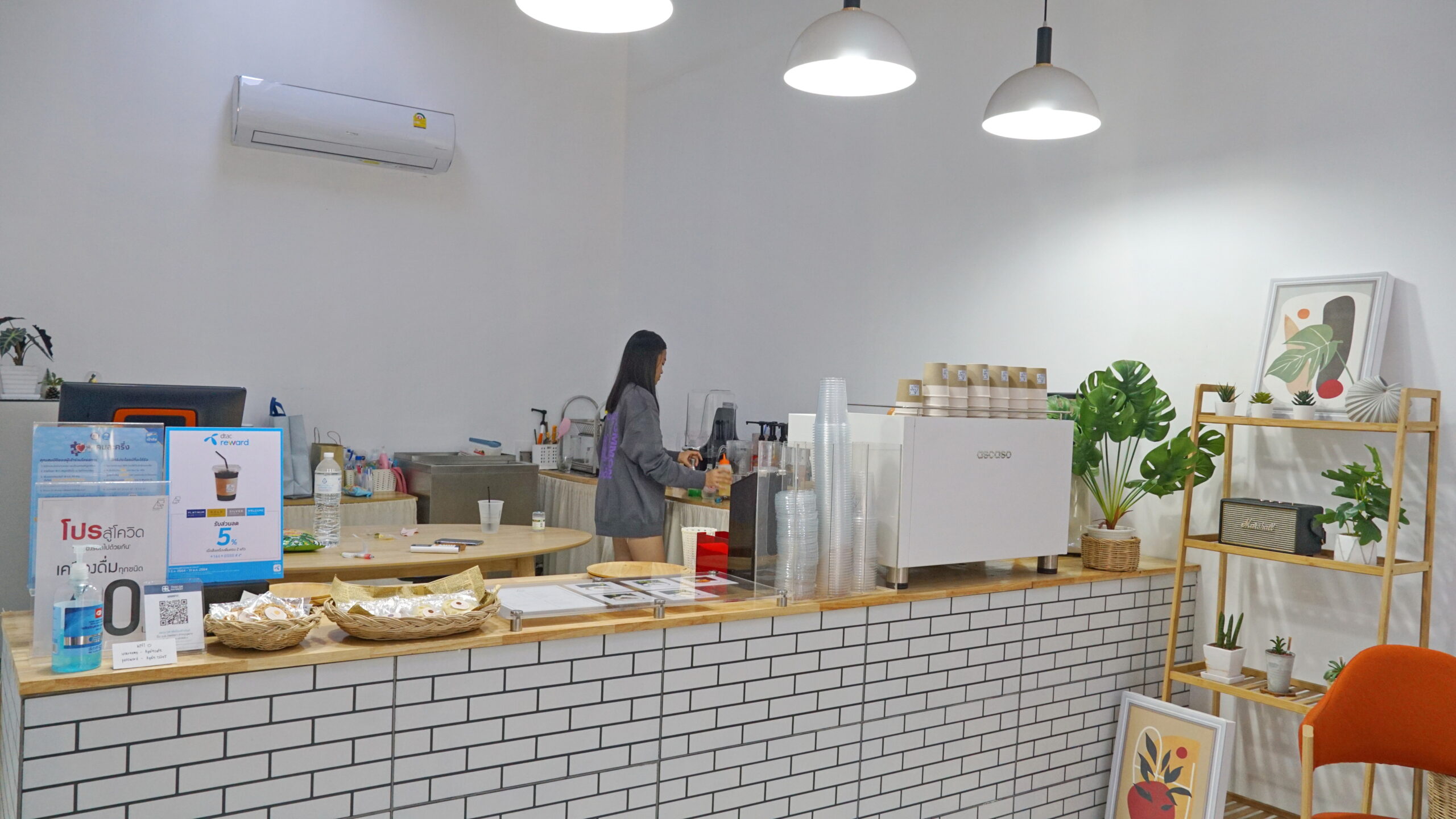 ด้านในสุดของร้านจะเป็นเคาน์เตอร์เครื่องดื่ม โดยตัวเคาน์เตอร์ตกในด้วยแผ่นกระเบื้องลายอิฐสีขาว ปูท็อปด้วยแผ่นไม้ จึงสะท้อนความมินิมอลได้อย่างชัดเจน
