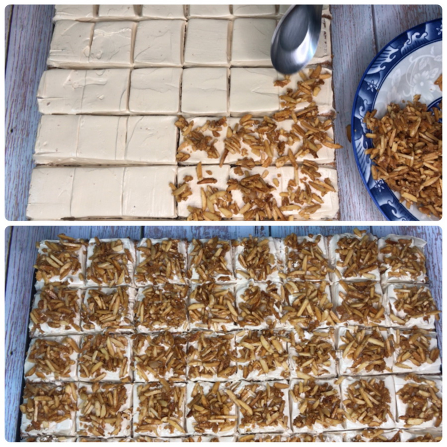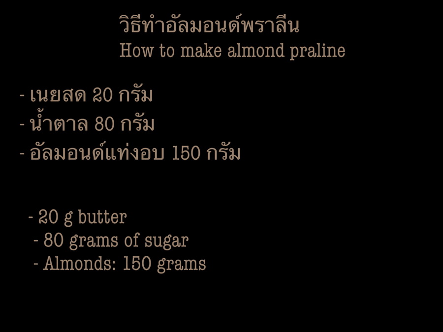 1. นำเนยสดและน้ำตาล ตั้งไฟใส่อัลมอนด์ลงไป ผสมจนกลายเป็นคาราเมลเคลือบถั่ว เสร็จแล้วปิดไฟ ผึ่งให้เย็นตัวก่อนนำมาตกแต่ง