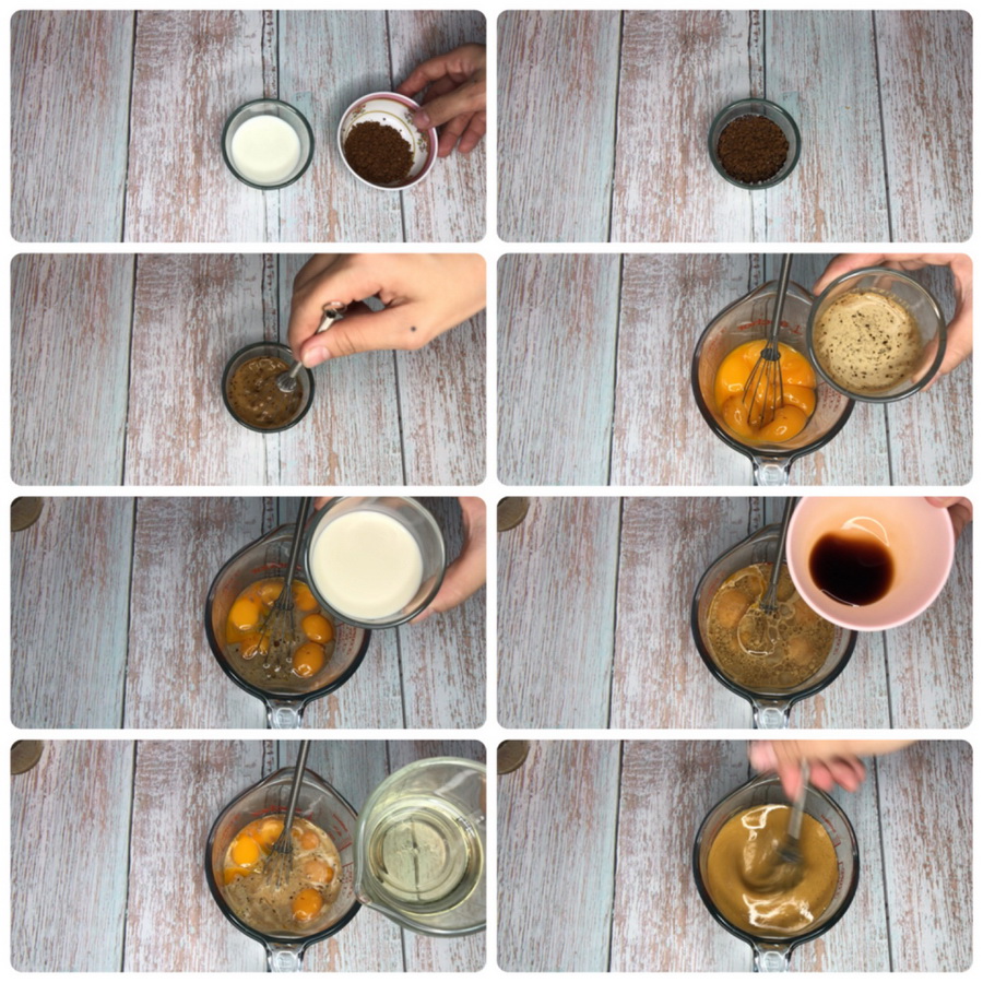 2. นำนมสดที่ผสมกาแฟแล้วเทลงไปในไข่แดง ตามด้วยน้ำมัน นมข้นจืด และวนิลา