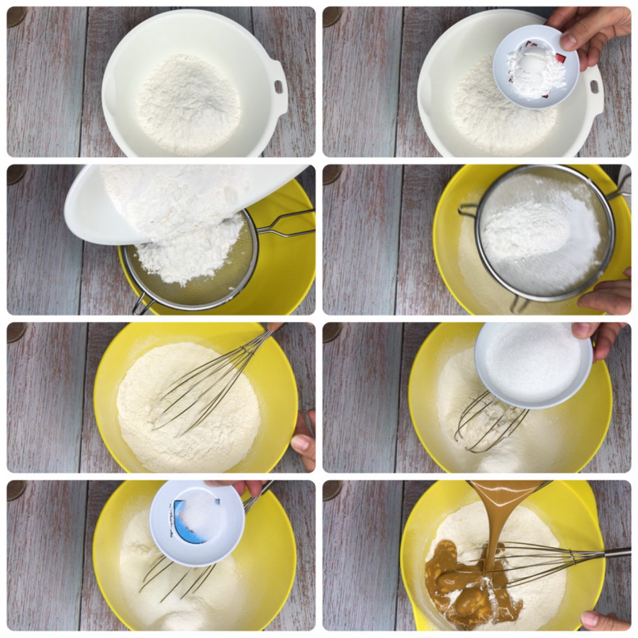 3. นำผงฟูกับแป้งผสมรวมกัน ร่อนลงในอ่างผสมตามด้วยเกลือ และน้ำตาล