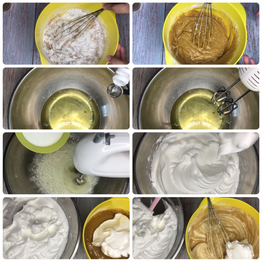 6. ผสมส่วนของไข่ขาวและไข่แดงให้เข้ากัน เทลงในพิมพ์ขนาด 8×12″