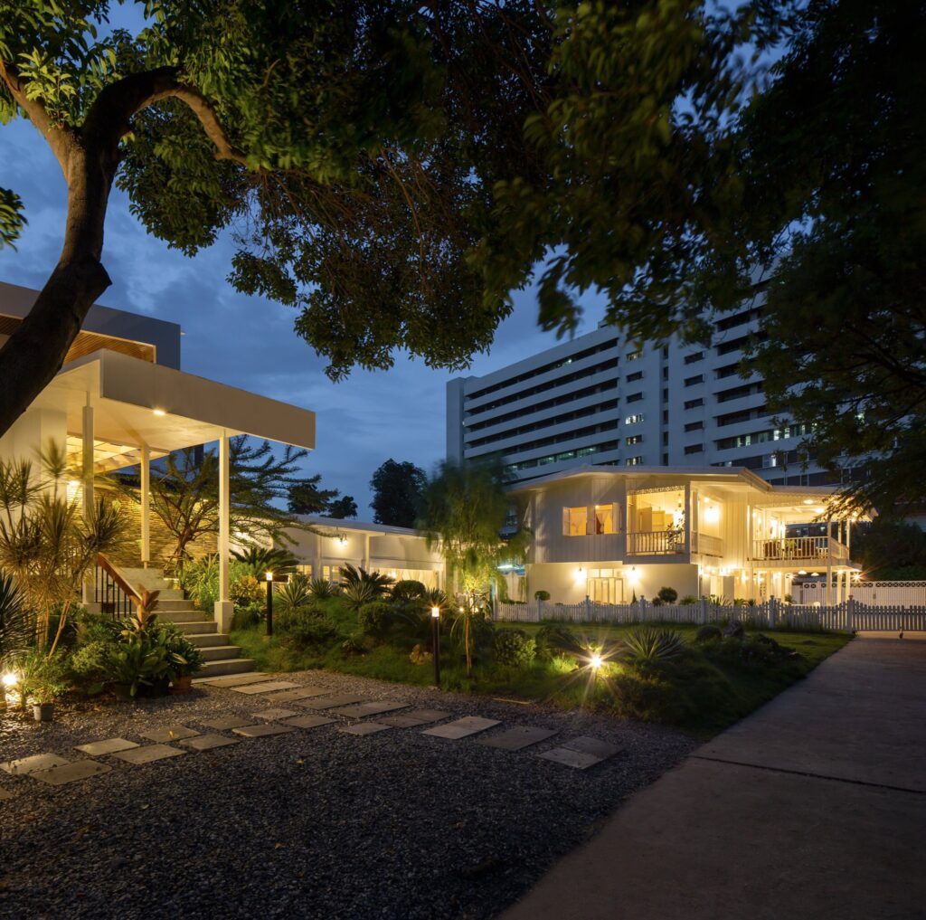 บรรยากาศยามค่ำคืน แสงไฟสีนวลตาเล่นกับผนังสีขาวของบ้าน