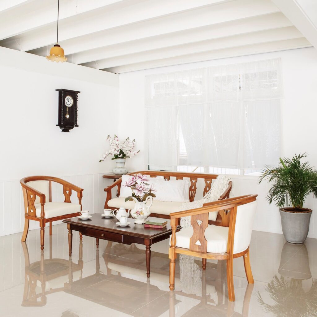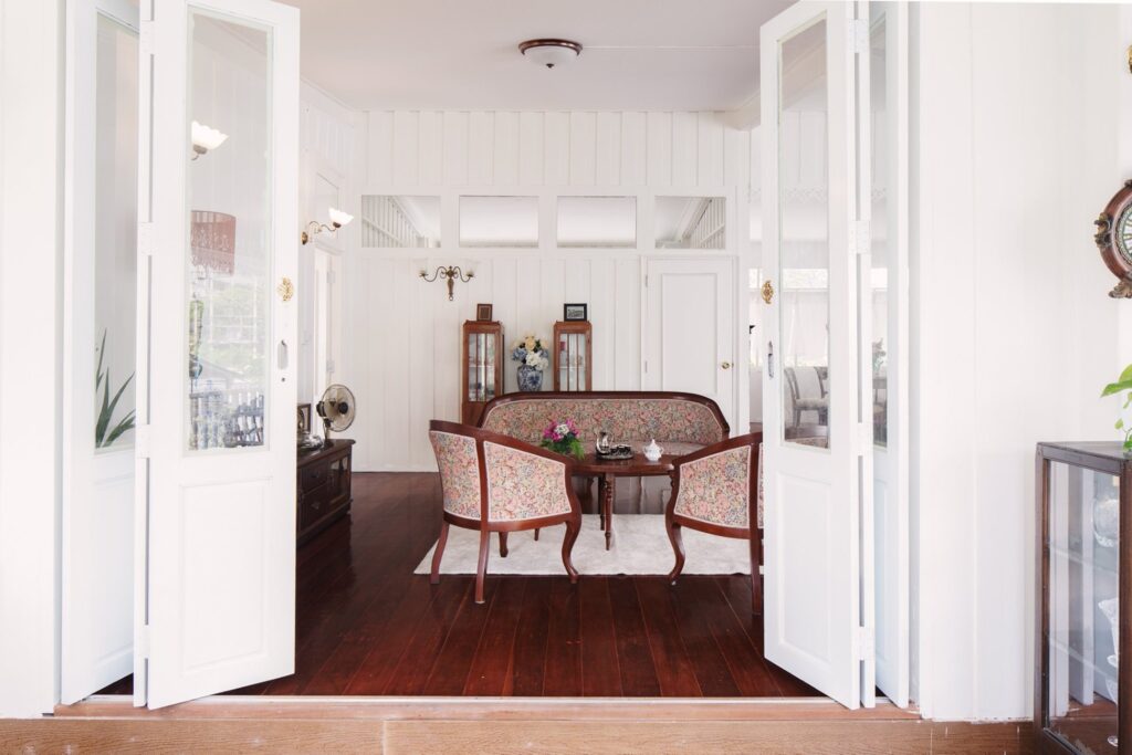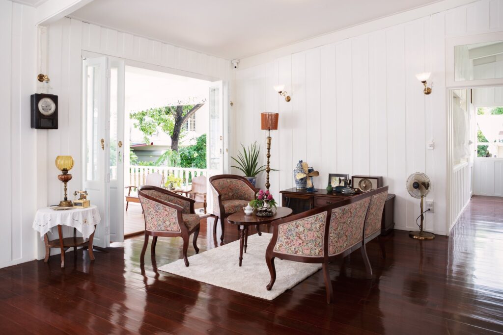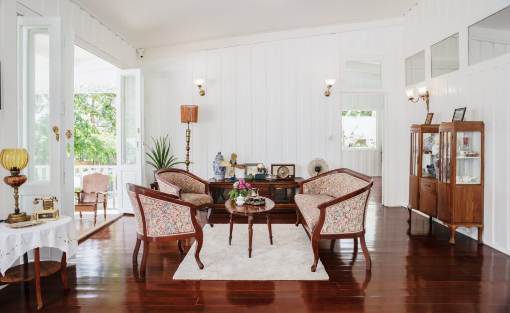 ภายในพื้นที่ห้องรับแขกบนชั้นสอง ยังคงเลือกใช้เฟอร์นิเจอร์ไม้ที่บุด้วยนวมที่เล่นลวดลายอันวิจิตรของดอกไม้เป็นหลัก