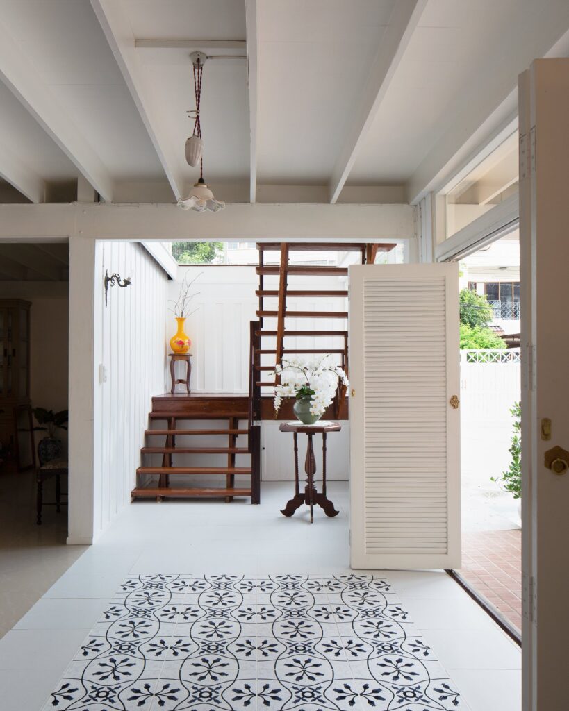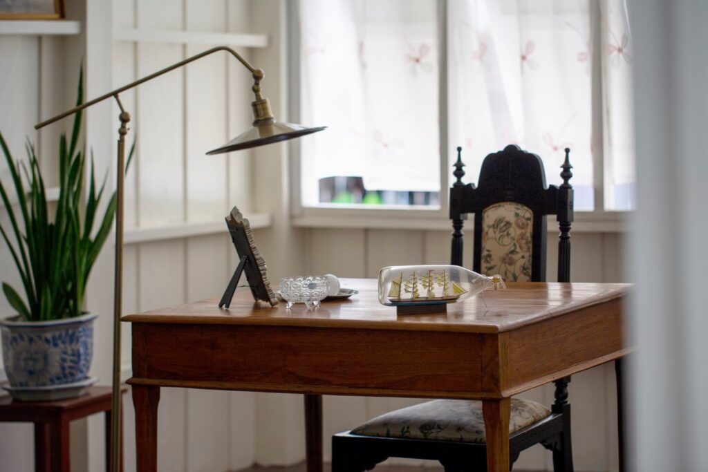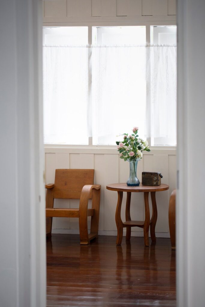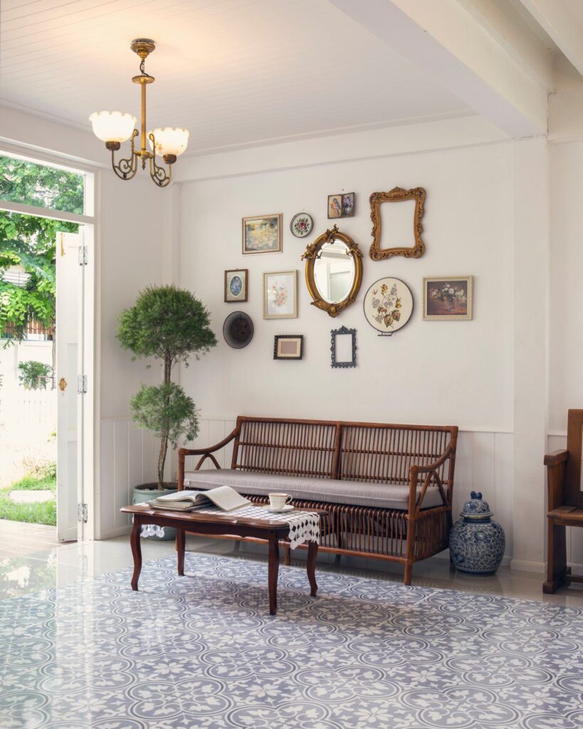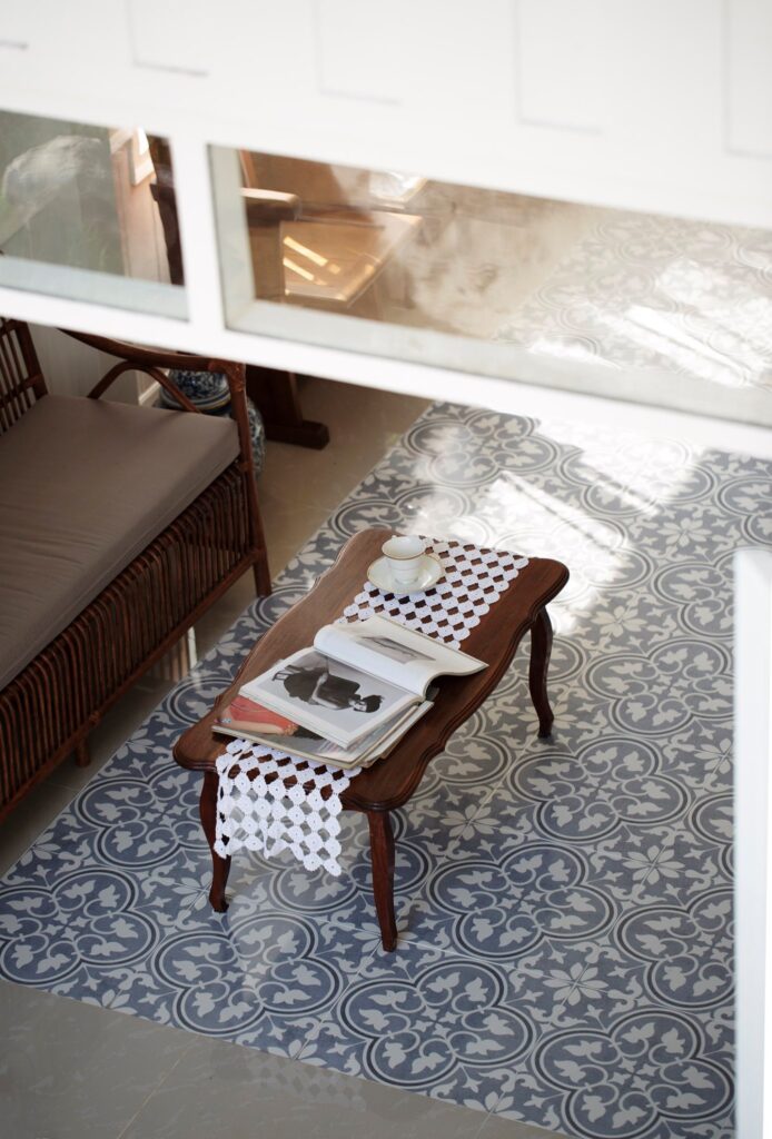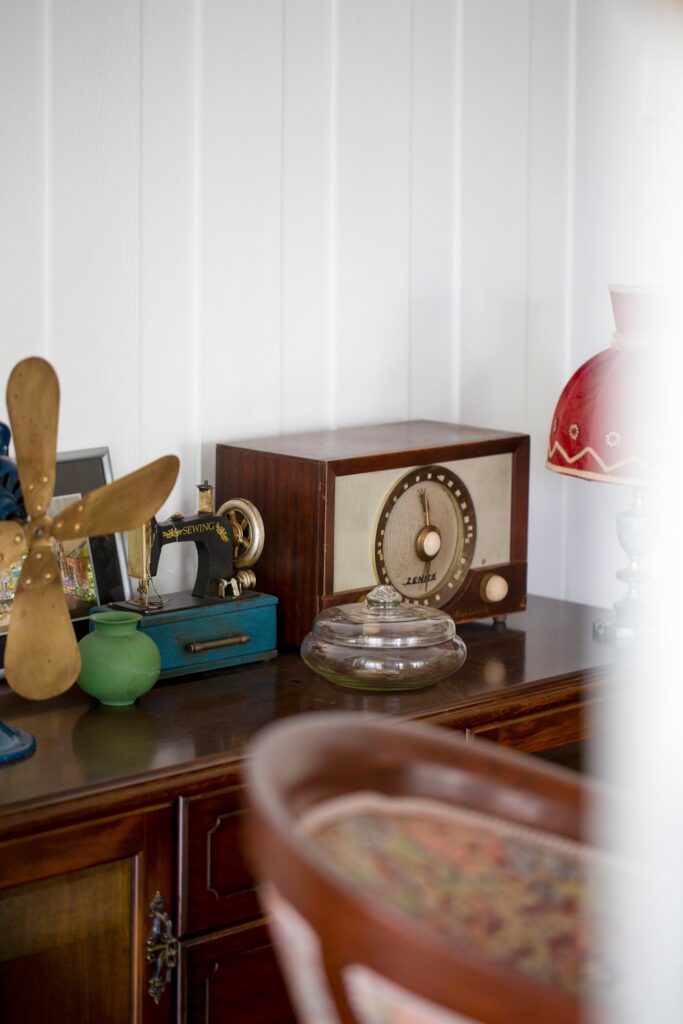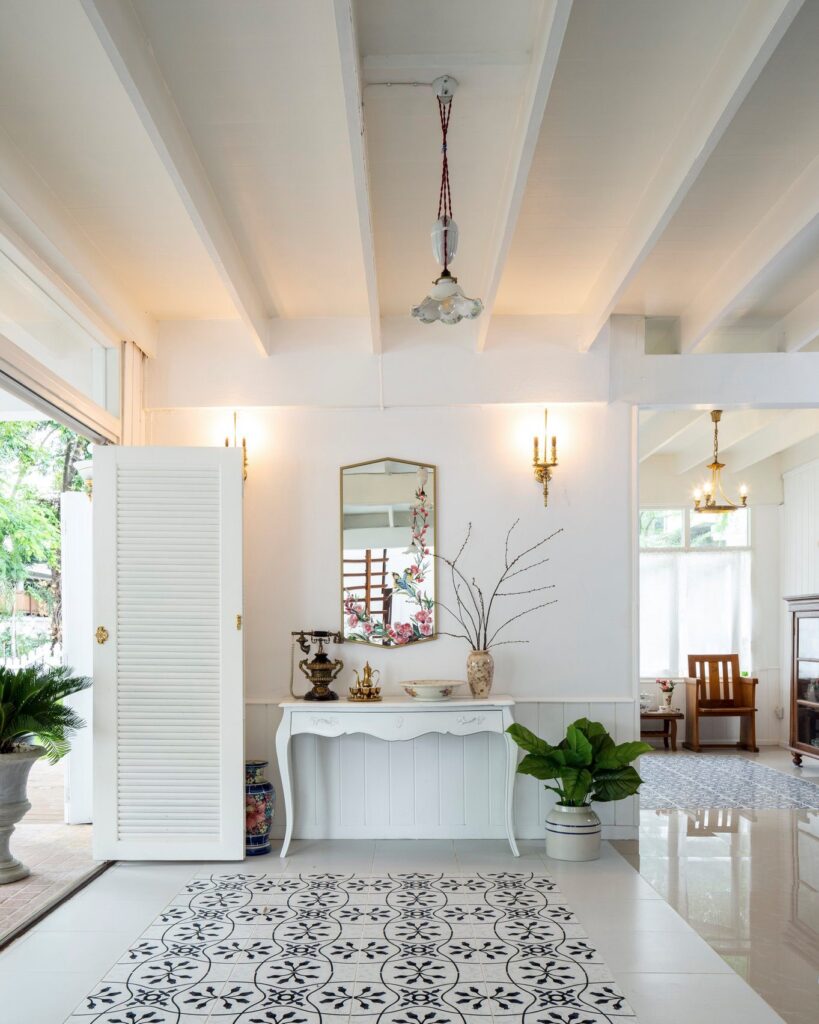 เมื่อเดินผ่านประตูเข้ามาภายในบ้าน เราก็จะพบกับมุมนี้ที่ถูกตกแต่งได้สวยงามน่าใช้เป็นพื้นที่ถ่ายภาพที่สุด โดยเฉพาะจากของตกแต่งโบราณอย่างโทรศัพท์และโคมไฟ
