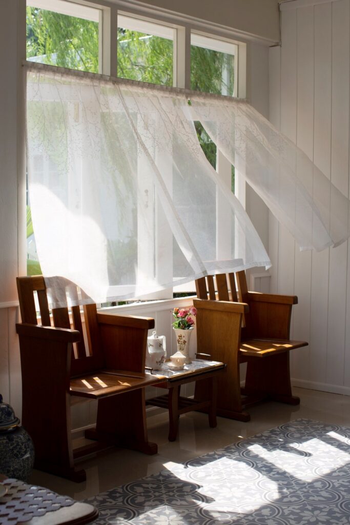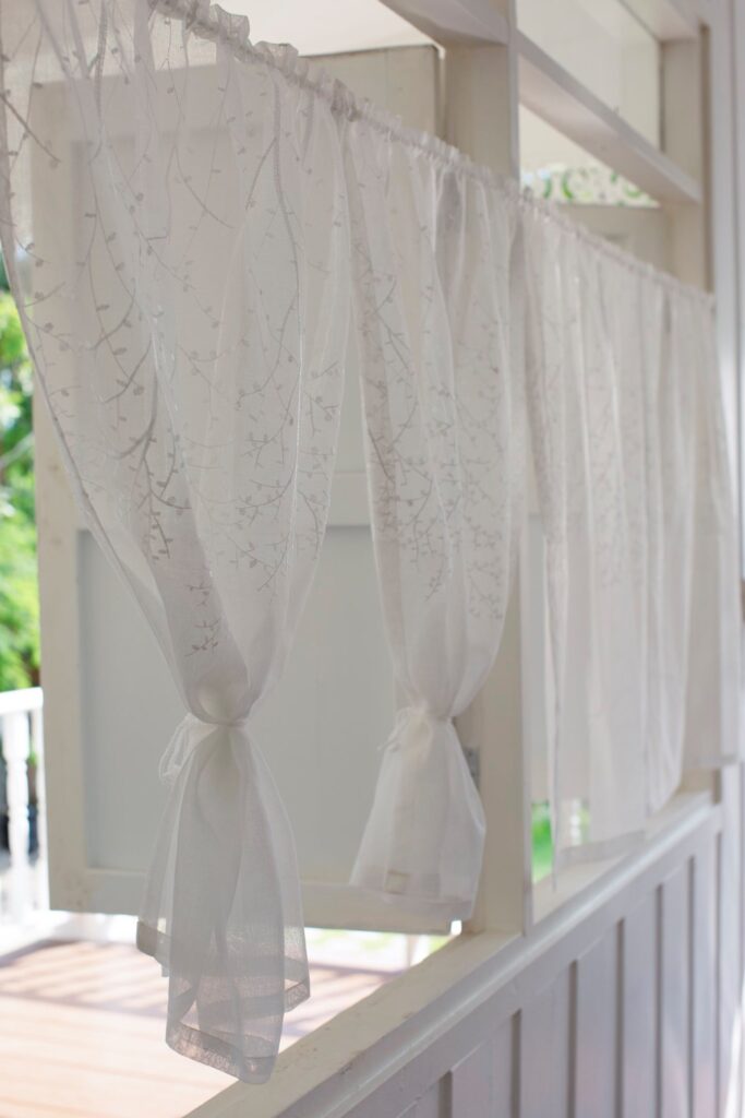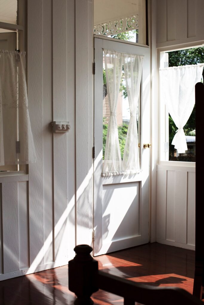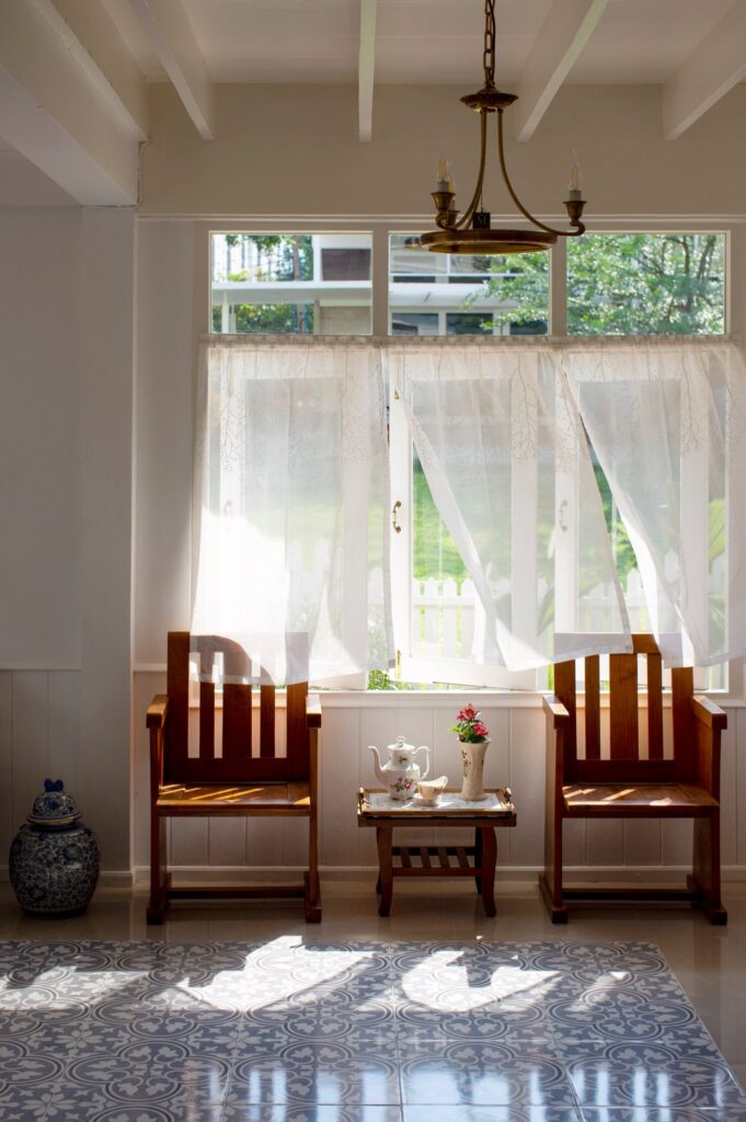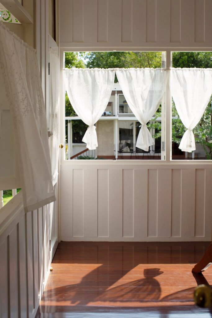 หน้าต่างแต่ละบานของบ้านมีความโปร่งโล่ง ติดตั้งด้วยผ้าม่านสีขาว เมื่อมีแสงแดดส่อง ตัวผ้าม่านก็จะช่วยกรองแสงอย่างพอดี เมื่อลมพัดก็ทำให้ผ้าม่านปลิวไสวสวยงาม