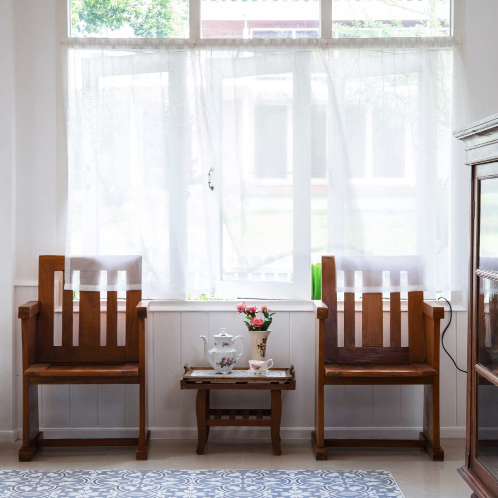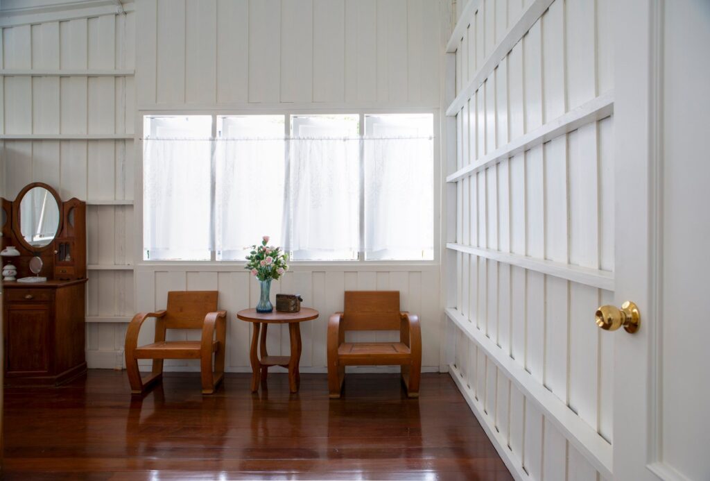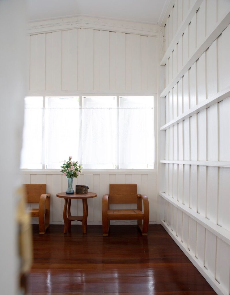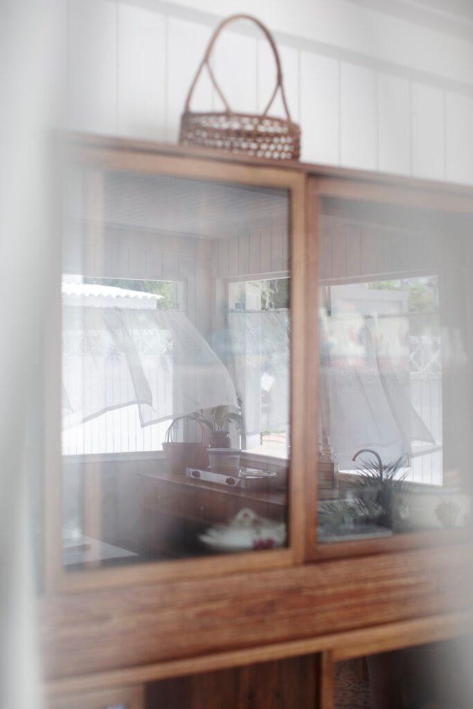หน้าต่างแต่ละบานของบ้านมีความโปร่งโล่ง ติดตั้งด้วยผ้าม่านสีขาว เมื่อมีแสงแดดส่อง ตัวผ้าม่านก็จะช่วยกรองแสงอย่างพอดี เมื่อลมพัดก็ทำให้ผ้าม่านปลิวไสวสวยงาม