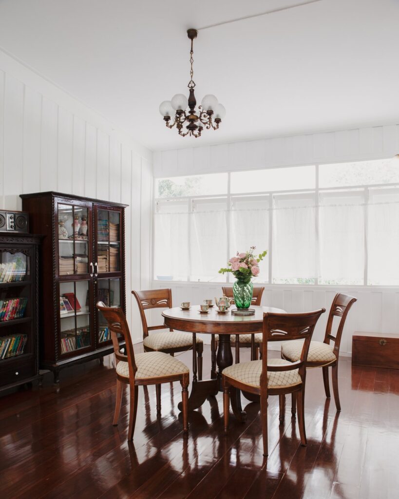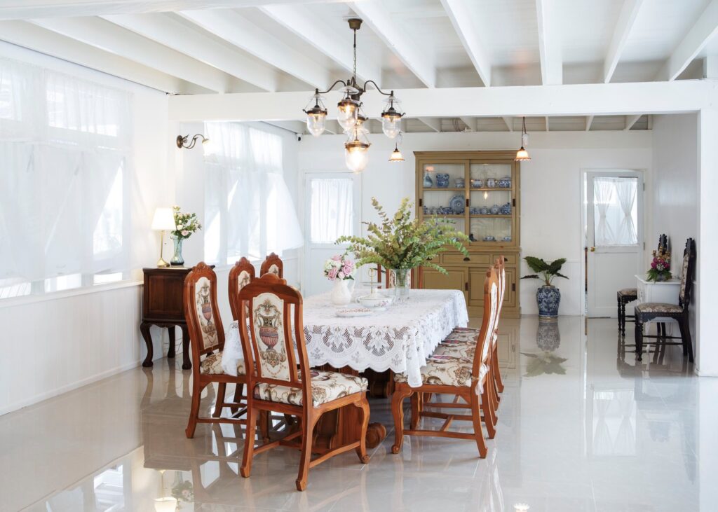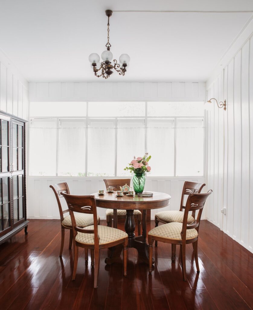 ภายในห้องรับประทานอาหารที่มีพื้นที่โปร่งโล่ง รายละเอียดการตกแต่งจะเน้นไปที่ชุดโต๊ะไม้ยาว บุด้วยเบาะที่มีลวดลายดอกไม้ให้ความหรูหรามีระดับ