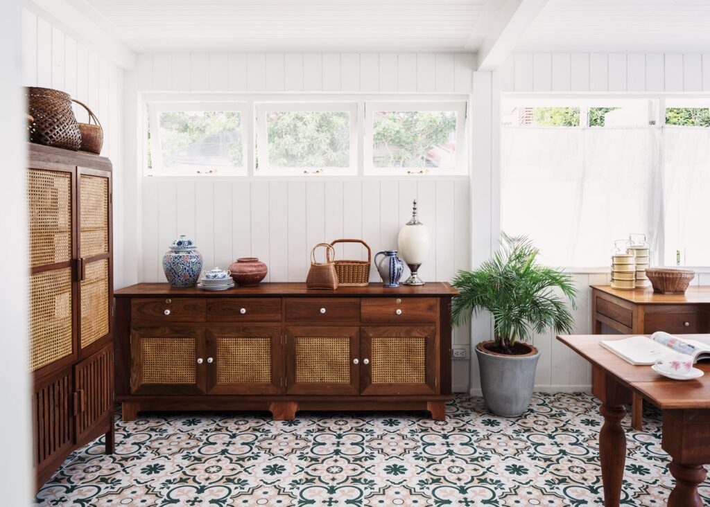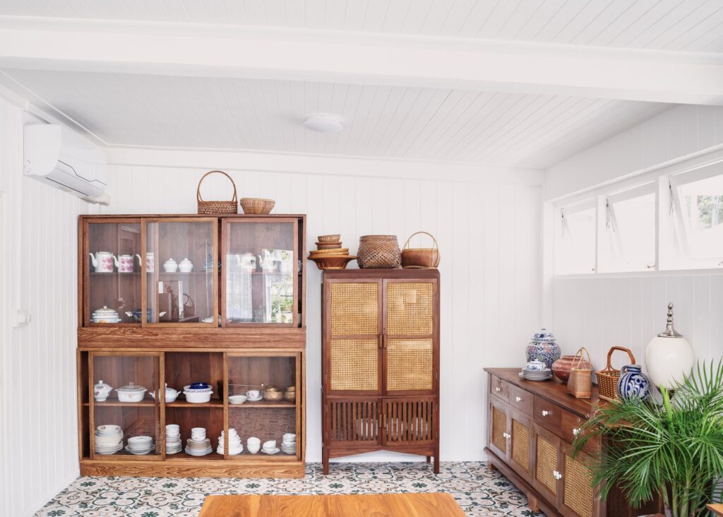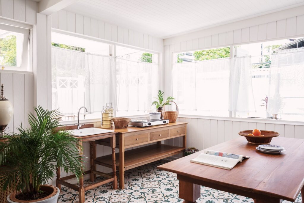 ห้องครัวไทยแนวย้อนยุค มีเฟอร์นิเจอร์ไม้เป็นหลัก พร้อมกับหน้าต่างแบบเปิดโล่งเพื่อระบายกลิ่นและควัน ให้บรรยากาศราวกลับห้องครัวของคุณยาย