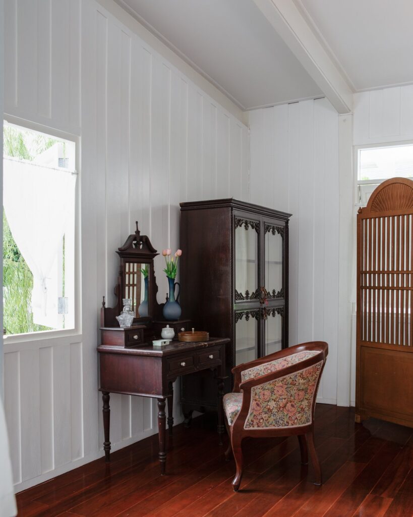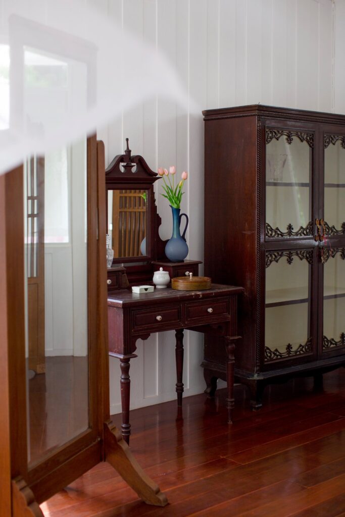 มุมโต๊ะเครื่องแป้งมีชุดโต๊ะที่มีรายละเอียดการออกแบบที่สวยงาม มีเนื้อวัสดุที่เก่าแบบวินเทจ เข้ากันดีกับตู้กระจกด้านข้าง