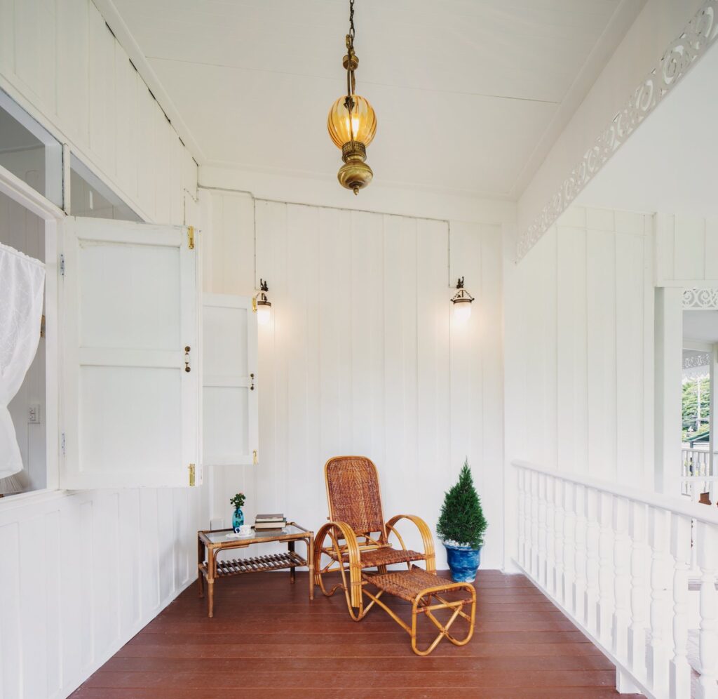 เฉลียงมุมนี้มีเก้าอี้สนามแบบไม้หวายให้ได้นอนเพลิดเพลินกัน