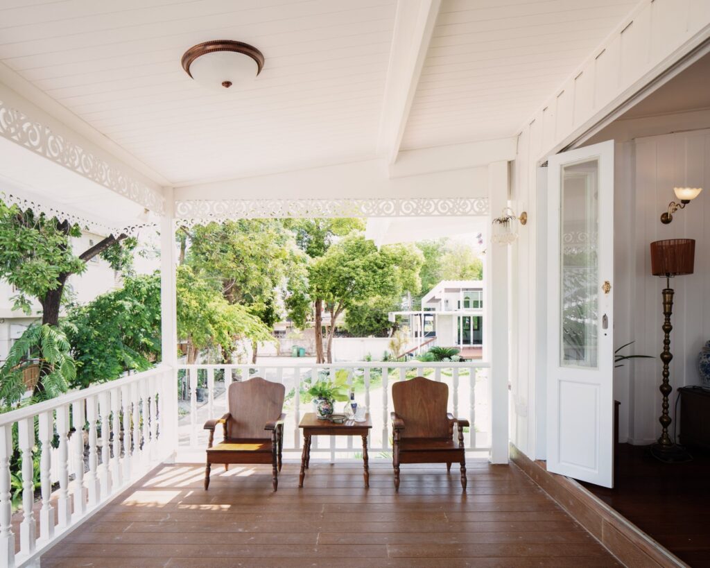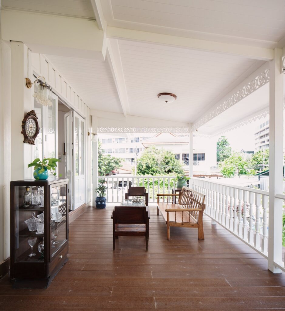 ภายนอกตัวบ้านมีพื้นที่ใช้ใช้งานจากเฉลียงและใต้ถุนที่เน้นความโปร่งโล่ง จึงเป็นพื้นที่ ๆ ใกล้ชิดกับธรรมชาตินอกบ้าน เข้ากับวิถีชีวิตของคนไทยที่ชื่นชอบการทำกิจกรรมนอกบ้าน