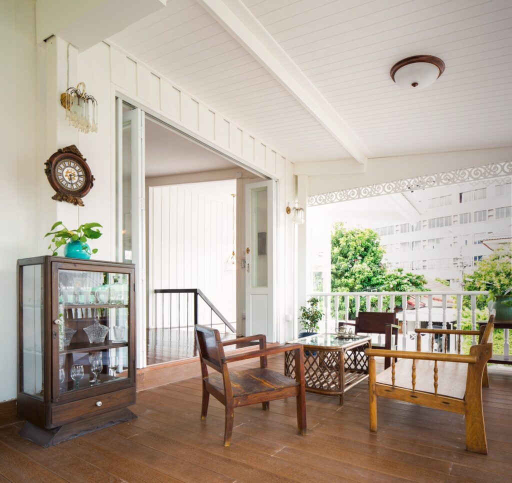 รอบตัวบ้านเน้นความโปร่งสบายตามแนวทางของบ้านบ้านไทยยุคเก่าด้วยหน้าต่างและประตูบานพับบานใหญ่จำนวนหลายบาน รวมถึงผนังกระจกใสที่แฝงกลิ่นอายแบบโมเดิร์น