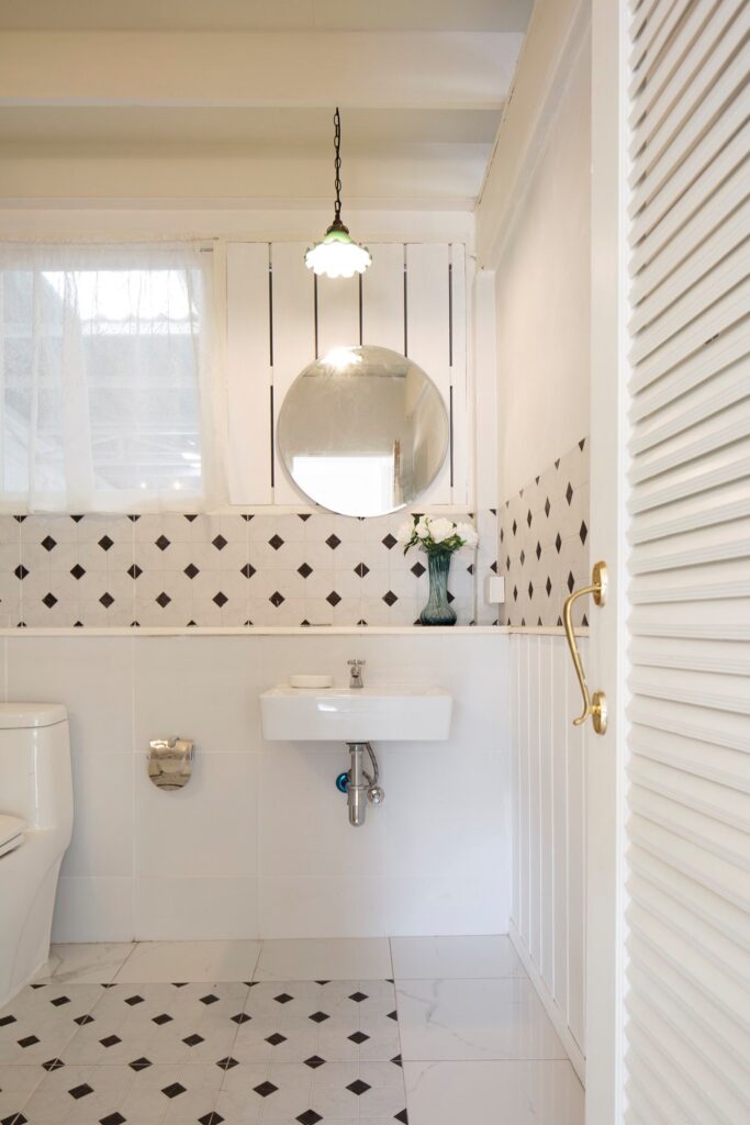 ในส่วนของห้องน้ำนั้น เป็นอีกพื้นที่หนึ่งของบ้านที่เก็บรายละเอียดการออกแบบและตกแต่งได้อย่างใส่ใจ ภายในสว่างสวยงามจากแผ่นกระเบื้องสีครีม