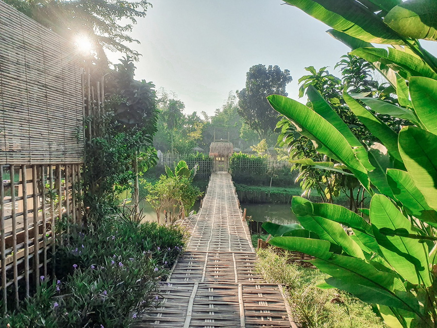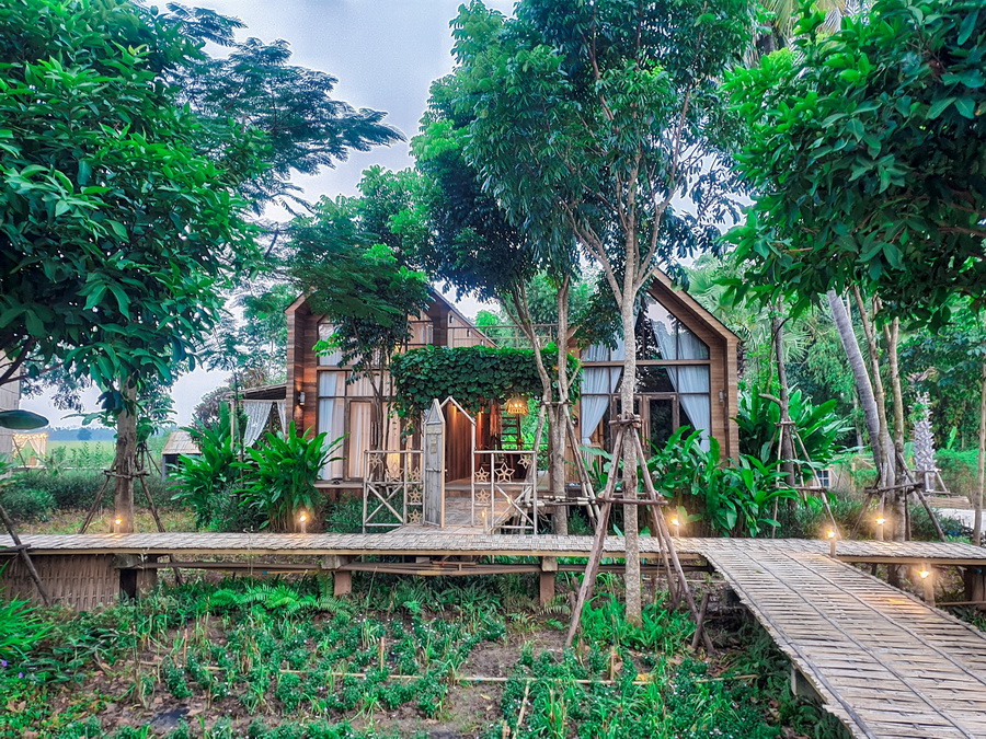 ชมสวนเกษตรและลานกิจกรรมกันไปแล้ว ถึงเวลาที่จะได้ไปชมส่วนของทีี่พักกันบ้าง โดยเราจะเดินผ่านสะพานไม้ไผ่แห่งนี้ที่ทอดยาวข้าวลำคลองมา