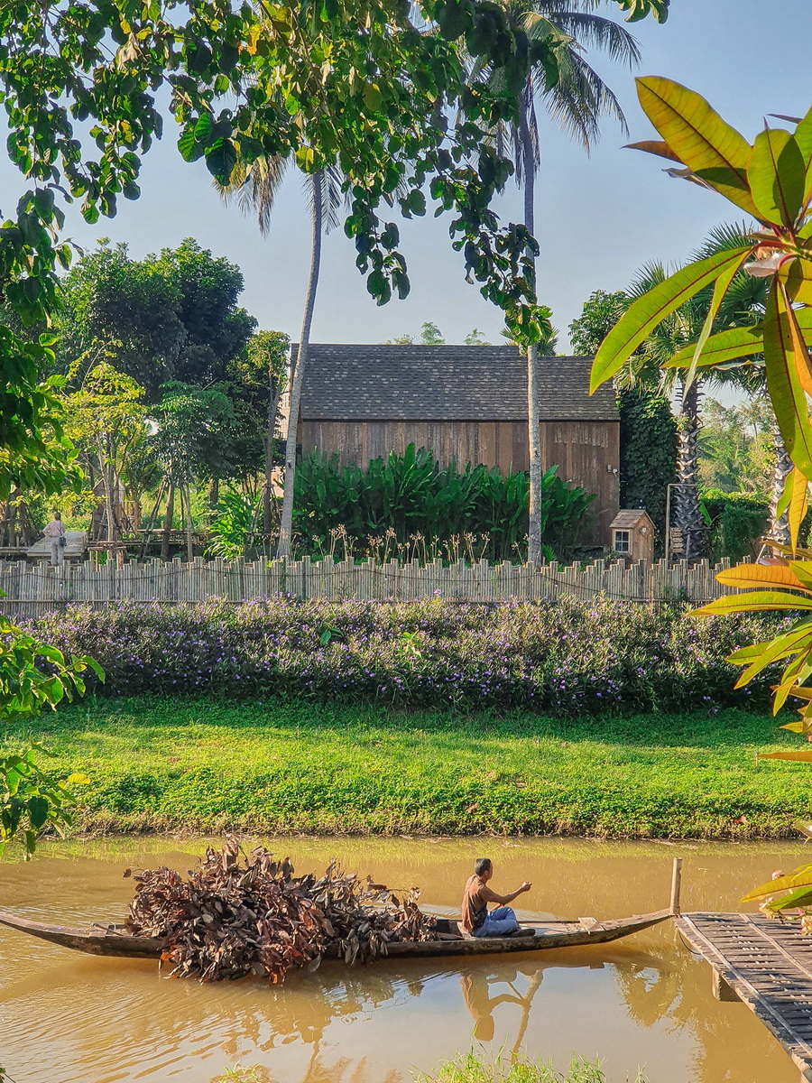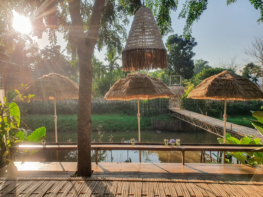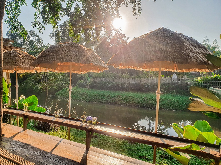 บริเวณอื่นๆ ของฟาร์มสเตย์แห่งนี้ก็มีพื้นที่สำหรับการพักผ่อนและทำกิจกรรมอีกหลายจุด อย่างเช่นมุมนี้ที่เป็นบาร์ยาวให้เราได้นั่งห้อยขา มีฉากหน้าเป็นคลองเล็กๆ