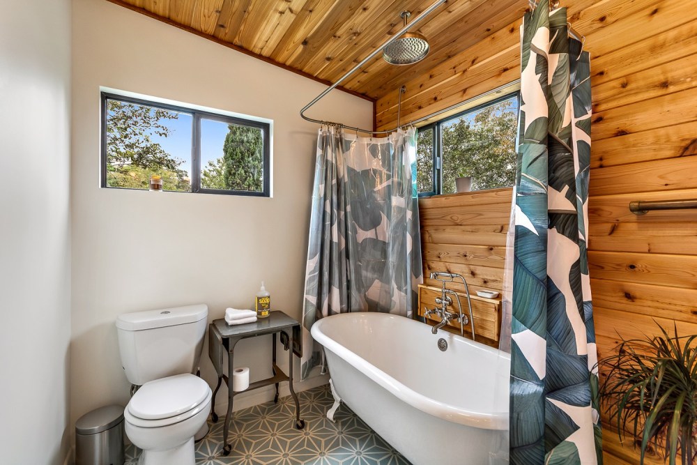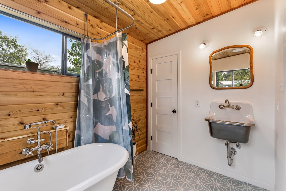 การตกแต่งห้องน้ำก็ยังคงความเป็นมิด-เซนจูรี่ โมเดิร์นไว้ด้วยผนังไม้ ผสานไปกับผนังโทนสีขาวและพื้นลายกราฟิกสวยงาม มาพร้อมฟังก์ชันที่ครบครัน ไม่ว่าจะเป็นซิงค์ล้างหน้า อ่างอาบน้ำ และโถสุขภัณฑ์