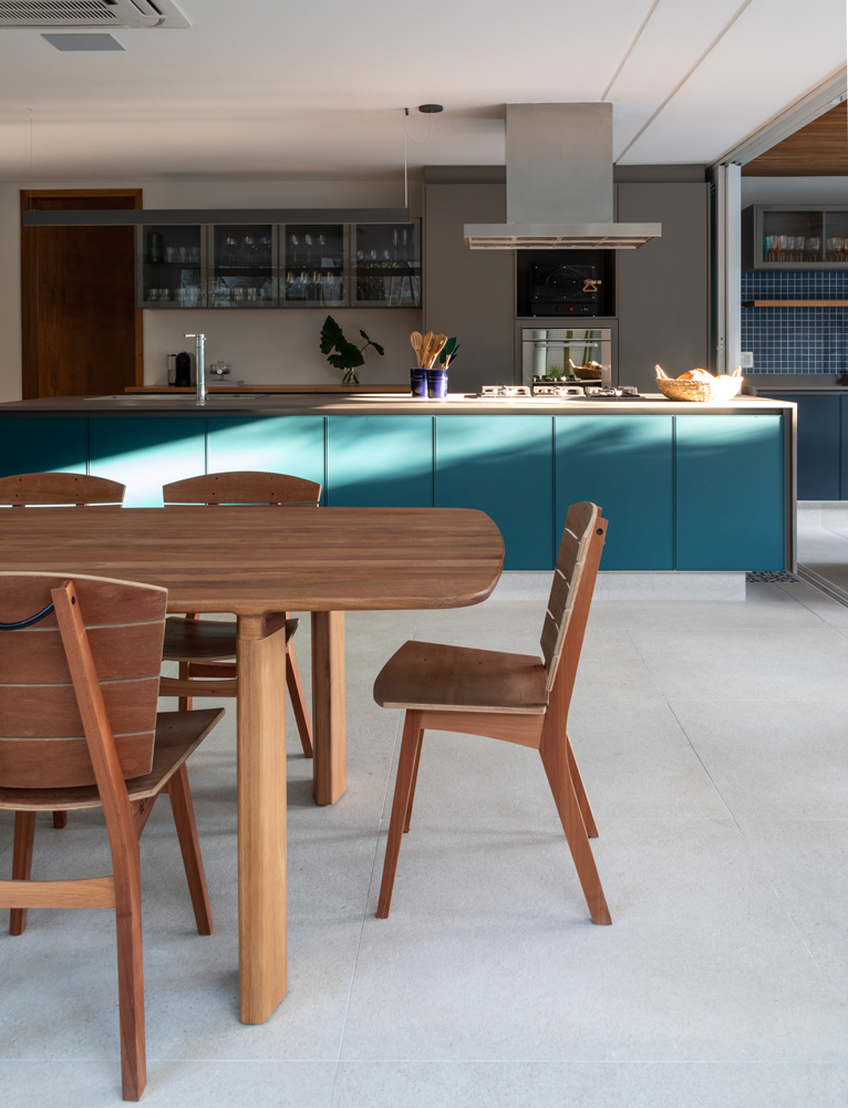 ภายในพื้นที่ห้องครัวก็จะมีเคาน์เตอร์ขนาดใหญ่ในโทนสีฟ้าที่รองรับการทำอาหารที่หลากหลาย เหมาะกับการสังสรรค์โดยเฉพาะ และใกล้ ๆ กันก็จะมีโต๊ะรับประทานอาหารอีกชุดด้วย