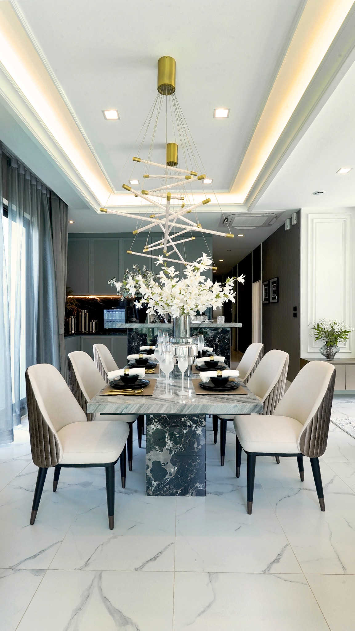 แต่ที่น่าสนใจคือพื้นที่ส่วนห้องรับแขก เชื่อมต่อกับโต๊ะทานข้าว มีมุมบาร์เครื่องดื่ม แล้วเชื่อมไปยังครัวที่อยู่หลังบ้านได้แบบเส้นทางเดียว ให้เดินต่อไปใช้ชีวิตไม่สะดุด