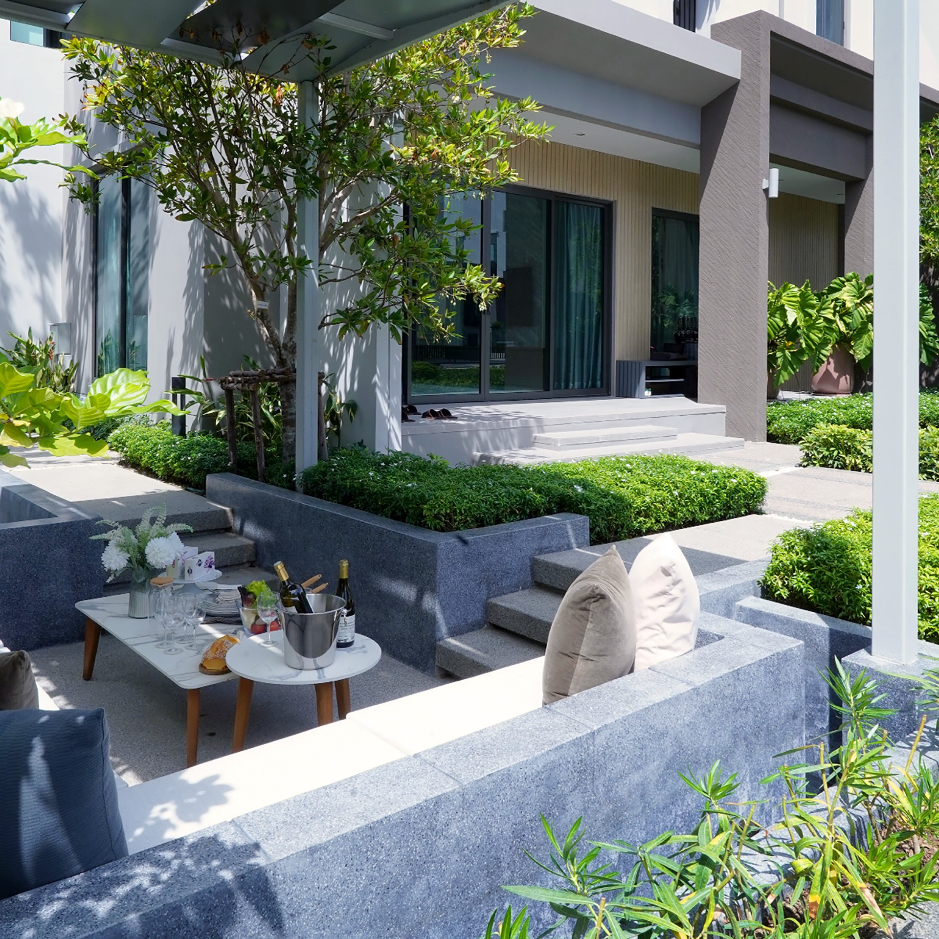 พื้นที่สวนสีเขียวรอบบ้าน พร้อมทีเด็ดคือมุมนั่งเล่นพักผ่อนอยู่ภายนอก โรงจอดรถขนาดใหญ่ที่จอดได้อย่างน้อย 3 คันแน่ๆ