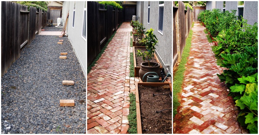 เริ่มแรกเธอปูทางเดินด้วยอิฐมอญ ให้เป็นลวดลายสลับฟันปลา สาเหตุที่เลือกใช้อิฐเป็นเพราะว่ามีความแข็งแรงทนทาน สามารถรองรับรถเข็นที่อัดแน่นไปด้วยวัสดุอื่นๆ ได้โดยไม่ต้องขนผ่านเข้าไปในตัวบ้าน