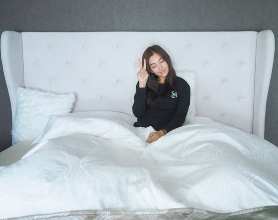 ภายในห้องนอนนั้นสาวเบลล่าเลือกใช้เตียงนอนตัวใหญ่ในโทนสีขาวที่ให้ความสะดวกสบายสุดๆ ซึ่งเข้ากันดีกับผนังห้องสีเทา
