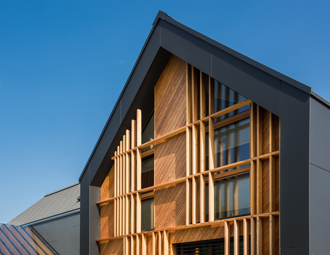 อาคารที่เป็นที่จอดรถถูกออกแบบเป็นพิเศษ โดยหลังคาจะเป็นแบบโปร่งใส ส่วนคานก็เป็นงานไม้ที่มีดีไซน์ที่พิเศษ เป็นจุดหนึ่งของบ้านที่สวยงามมาก