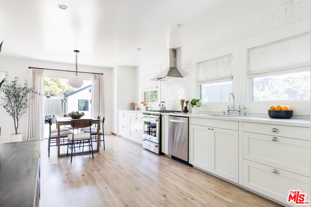 สำหรับห้องครัว จะเป็นส่วนที่มีพื้นที่ใช้สอยค่อนข้างกว้าง สังเกตได้จากเคาน์เตอร์ครัวสีขาวที่ออกแบบทอดยาวตลอดแนวผนัง ใกล้ ๆ กันก็มีโต๊ะสำหรับรับประทานอาหารตั้งเอาไว้ด้วย