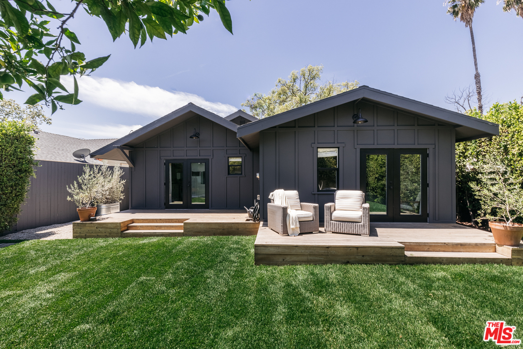 แน่นอนว่าเพื่อให้ตอบโจทย์ไลฟ์สไตล์คนอเมริกัน บริเวณหลังบ้านจึงมีเฉลียงไม้ที่กว้างและเปิดโล่ง พร้อมกับสนามหญ้ากว้าง ๆ เพื่อให้สามารถทำกิจกรรมกลางแจ้งได้อย่างจุใจ