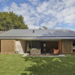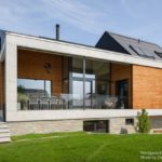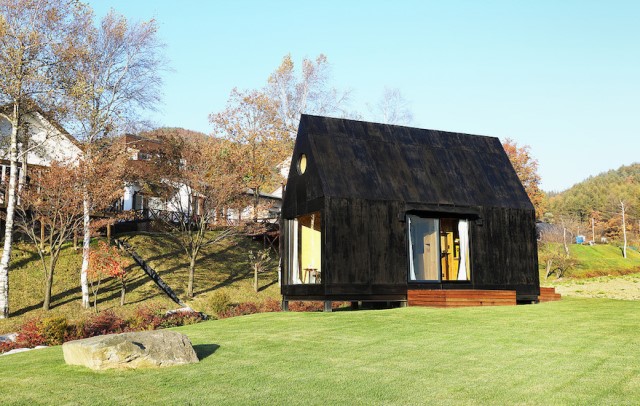ตัวบ้านโคร้งสร้างไม้ ออกแบบรูปทรงแบบเรียบง่าย ทรงสี่เหลี่ยม ตกแต่งด้วยผนังจากไม้ สีดำทั้งหลัง ใช้หลังคาทรงจั่ว ชายคาสั้น ดูเรียบง่ายที่สุด