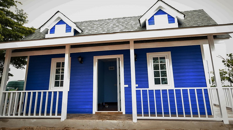 บ้านหลังนี้เป็นบ้านประเภทสมาร์ทโฮม ซึ่งก็คือบ้านสำเร็จรูปที่ไปสร้างหน้างาน แบบบ้านและวัสดุสามารถเปลี่ยนได้ตามแบบที่เจ้าของบ้านต้องการ ตัวบ้านมีขนาดชั้นเดียว หลังคาทรงหน้าจั่ว ผนังภายนอกตกแต่งด้วยไม้ฝาซ้อนชั้นทาด้วยสีฟ้าเข้ม ตัดขอบมุมด้วยโทนสีขาวเรียบง่าย