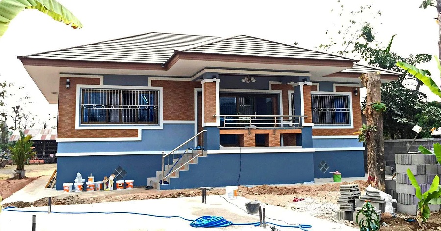 ตัวบ้านชั้นเดียว ฐานของบ้านถูกยกขึ้นสูง จึงช่วยป้องกันปัญหาน้ำท่วมได้ดี หลังคาของบ้านเป็นหลงปั้นหยาที่มุงด้วยกระเบื้องแบบเรียบในโทนสีเข้ม ผนังภายนอกเลือกใช้โทนสีฟ้าเล่นเฉดสีเข้ม-อ่อน พร้อมกับโทนสีน้ำตาล