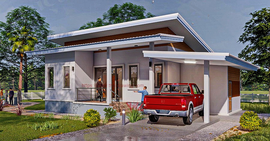 เข้ามาชมพื้นที่ภายในบ้านกันเลยค่ะ บริเวณหน้าบ้านจะมีที่จอดรถ 1 คันในที่ร่ม และเมื่อเดินเข้าไปในด้านจะพบกับโถงรับแขกเป็นอันดับแรก ถัดไปติดกันจะเป็นห้องนอน 2 ห้อง ส่วนห้องครัวจะอยู่ใกล้กับที่จอดรถ นอกจากนี้ยังมีห้องน้ำใกล้ๆ กัน เพื่อความสะดวกในการใช้งาน