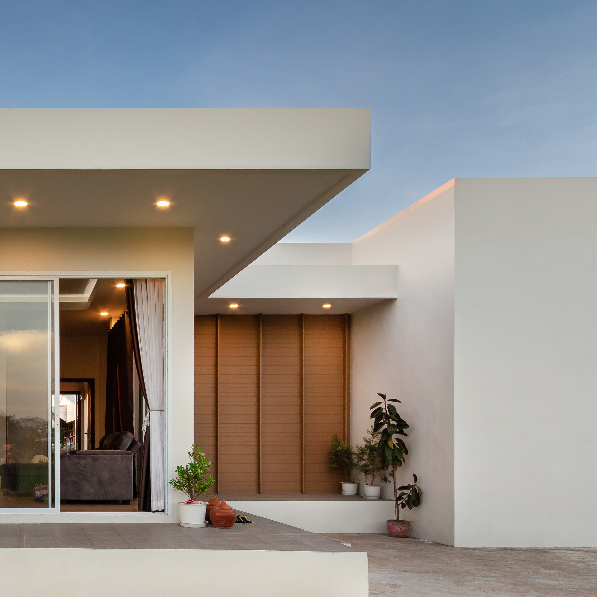 จริง ๆ แล้ว บ้านทรงกล่องแบบนี้ มักจะทำให้อากาศภายในร้อนตลอด ทางสถาปนิกเลยออกแบบและเลือกใช้วัสดุที่กันความร้อนได้สูง