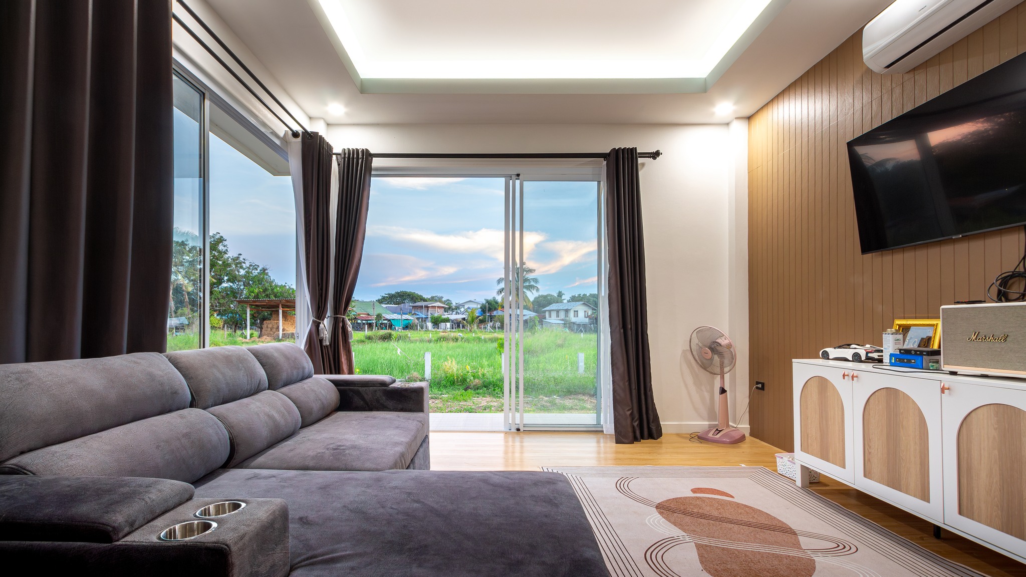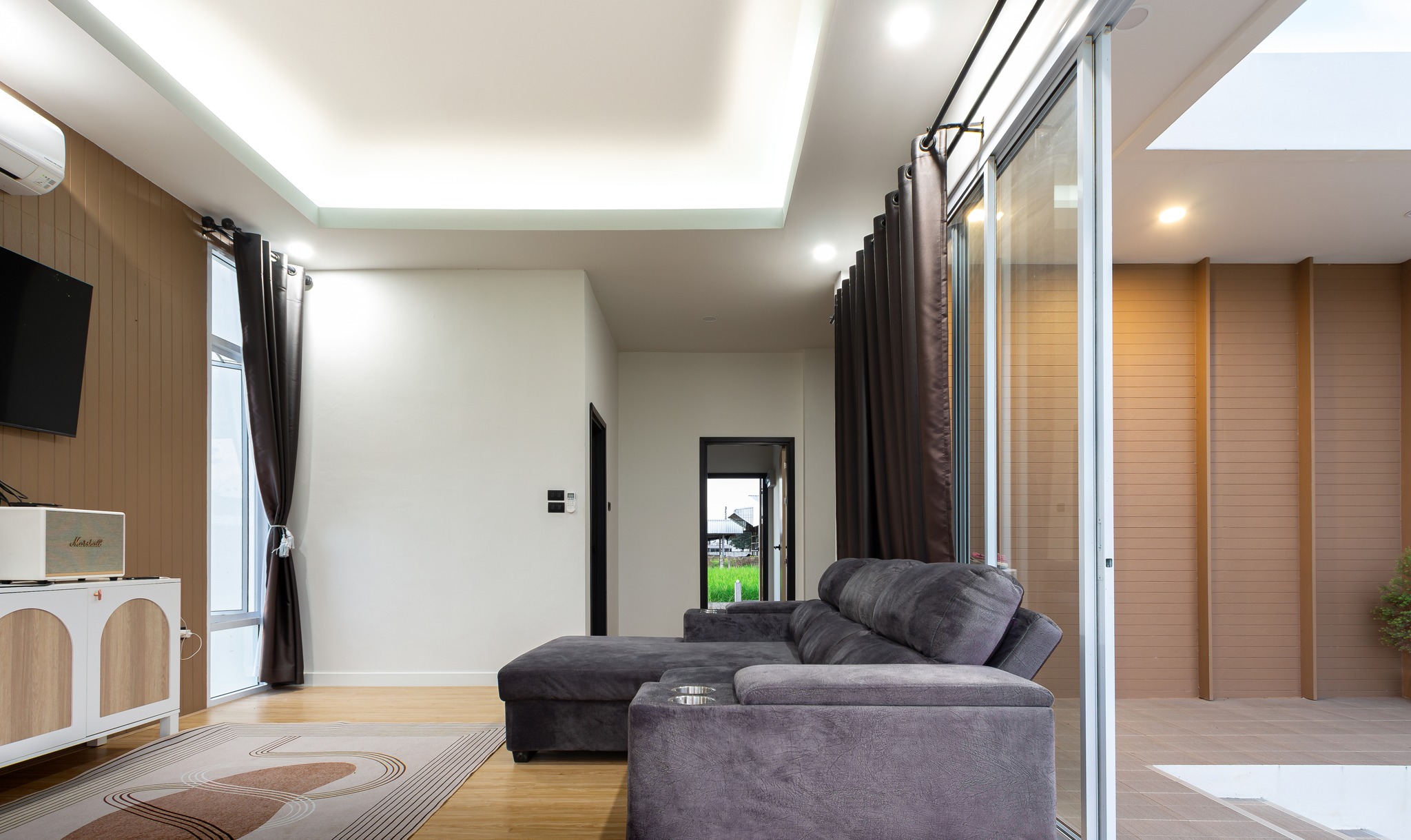 มีลานกิจกรรมครอบครัว หรือในภาษาอีสานเรียกว่า ”เดิ่นบ้าน“ สำหรับปาร์ตี้หมูกะทะ และมุมมองห้องนั่งเล่นต้องเห็นวิวทุ่งนา บรรยากาศเหมาะกับการผักผ่อนสุดๆ