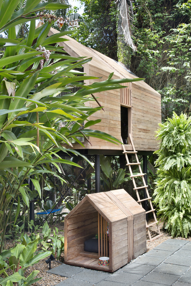 อาคารหลังนี้จะเป็นบ้านต้นไม้ขนาดพอเหมาะสำหรับเด็ก ซึ่งก่อสร้างด้วยฐานโครงเหล็กที่ให้ความมั่นคงแข็งแรง จึงมั่นใจได้ว่าจะปลอดภัยกับลูกน้อย ด้านล่างจะเป็นบ้านสุนัขที่ออกแบบในดีไซน์เดียวกันกับบ้านต้นไม้
