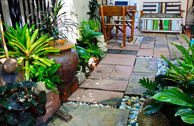 ตอนนี้อุปกรณ์แต่งสวนครบแล้ว เราก็เริ่มจัดสวนด้วยการขุดต้นจั๋งทิ้ง ปรับพื้นที่ (พื้นถมด้วยทรายแล้ว ก็เลยปรับง่าย แค่เอาจอบลากๆ เอาระดับน้ำวางไม่ให้มันเอียงมาก) มาหนักก็อีตอนยกหินทรายปูพื้นนี่แหละค่ะ ยกไปได้ห้าหกก้อน พาลจะหน้ามืดเอา ทำมั่งพักมั่ง แดดร่มลมตกเราก็ปูพื้นเสร็จ ยกเก้าอี้มาวางนั่งพักเหนื่อย