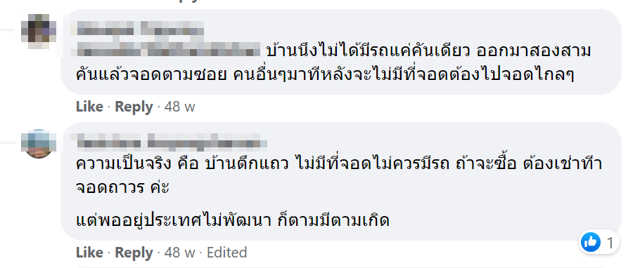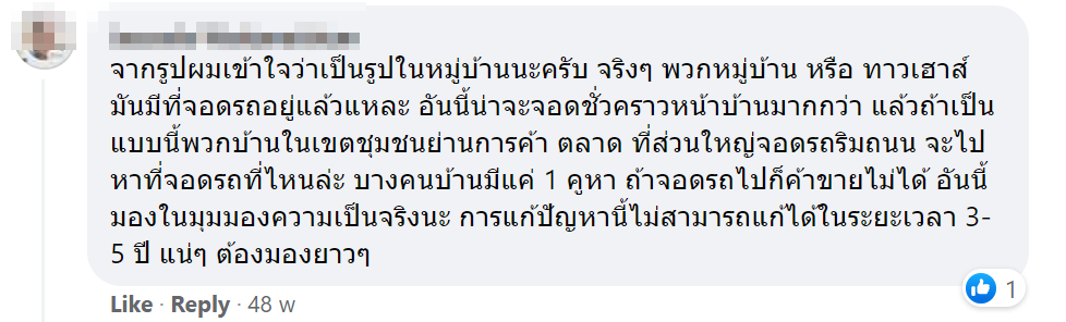 ซึ่งบางคนอาจจะยกเหตุผลบอกว่า ที่จอดน้อย เลยต้องจอดหน้าบ้าน ขณะที่อีกส่วนก็มองว่า หลายโครงการก็มีที่จอดรถให้ ควรจอดในรั้ว หรือกระทั่งก่อนทำโครงการ ก็ควรจะมีที่จอดให้เพียงพอกับทุกๆ บ้านอีกด้วย