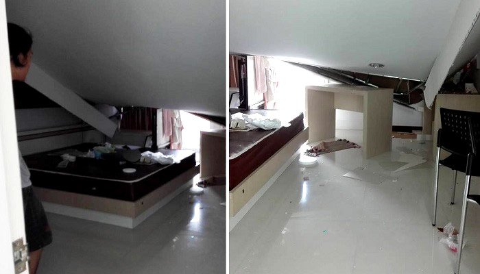 แต่โชคดีที่ในห้องยังมีโต๊ะเขียนแบบที่ค่อนข้างสูง ฝ้าที่ถล่มจึงถูกโต๊ะเขียนแบบค้ำไว้ ไม่ทับไปถึงบริเวณเตียงที่รูมเมทกำลังนอนอยู่