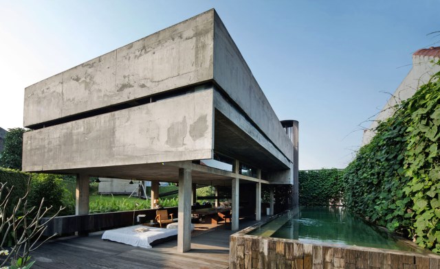 บ้านขนาดใหญ่ดีไซน์โมเดิร์น ตกแต่วด้วยปูนเปลือยให้เป็นตัวเอกของบ้าน บ้านรูปทรงกล่อง เจาะช่องเปิดขนาดใหญ่ และจำนวนมาก เน้นให้สอดคล้องไปกับฟังก์ชันภายในอีกด้วย