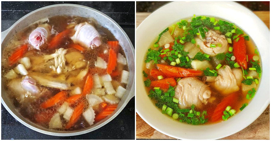 1. เริ่มจากทำน้ำซุปก่อนโดยตั้งหม้อซุปไก่ใส่น้ำ ใส่กระเทียม รากผักชี ที่ทุบพอแตกลงไปในหม้อซุปตามด้วย แครอท หัวไซเท้า หัวหอม เกลือทะเล พริไทยดำป่น