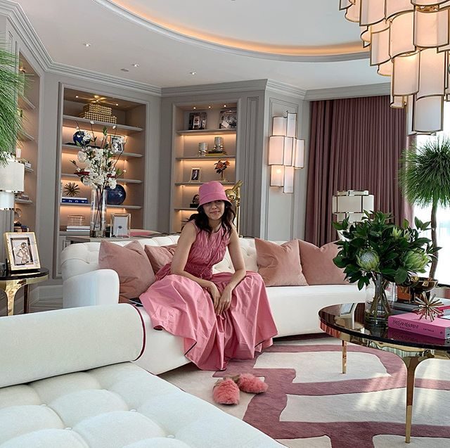 สำหรับห้องนั่งเล่นของสาวชมพู่ ตกแต่งด้วยโทนสีหวานอย่างสีชมพู ซึ่งบ่งบอกตัวตนของนางได้อย่างชัดเจนโเลือกใช้โซฟายาวสีขาว ประดับไปด้วยหมอนสีชมพู สวยลงตัวควบคู่ไปกับเก้าอี้โซฟาสีชมพูอ่อน